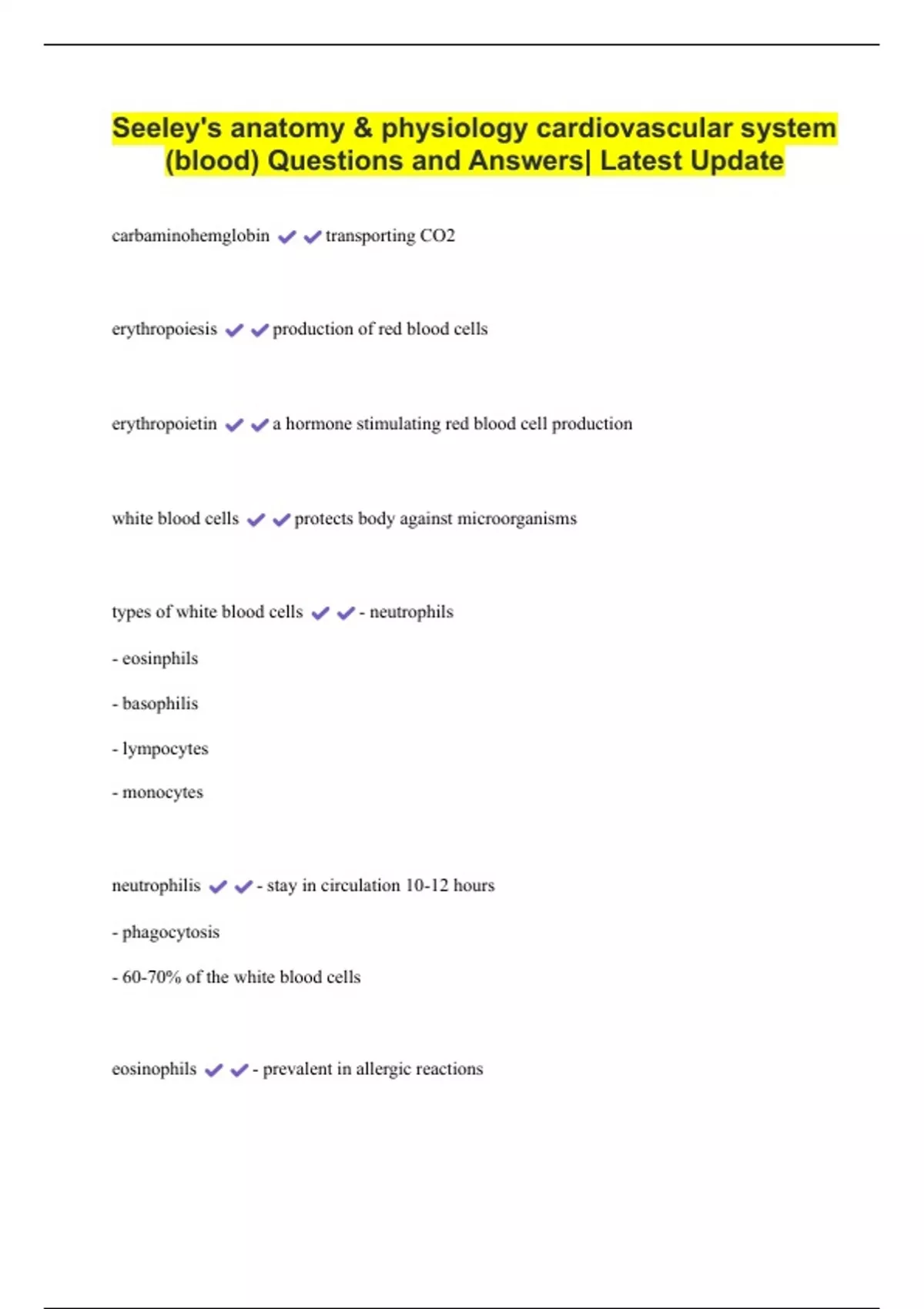 Seeley's anatomy & physiology cardiovascular system (blood) Questions and Answers| Latest Update