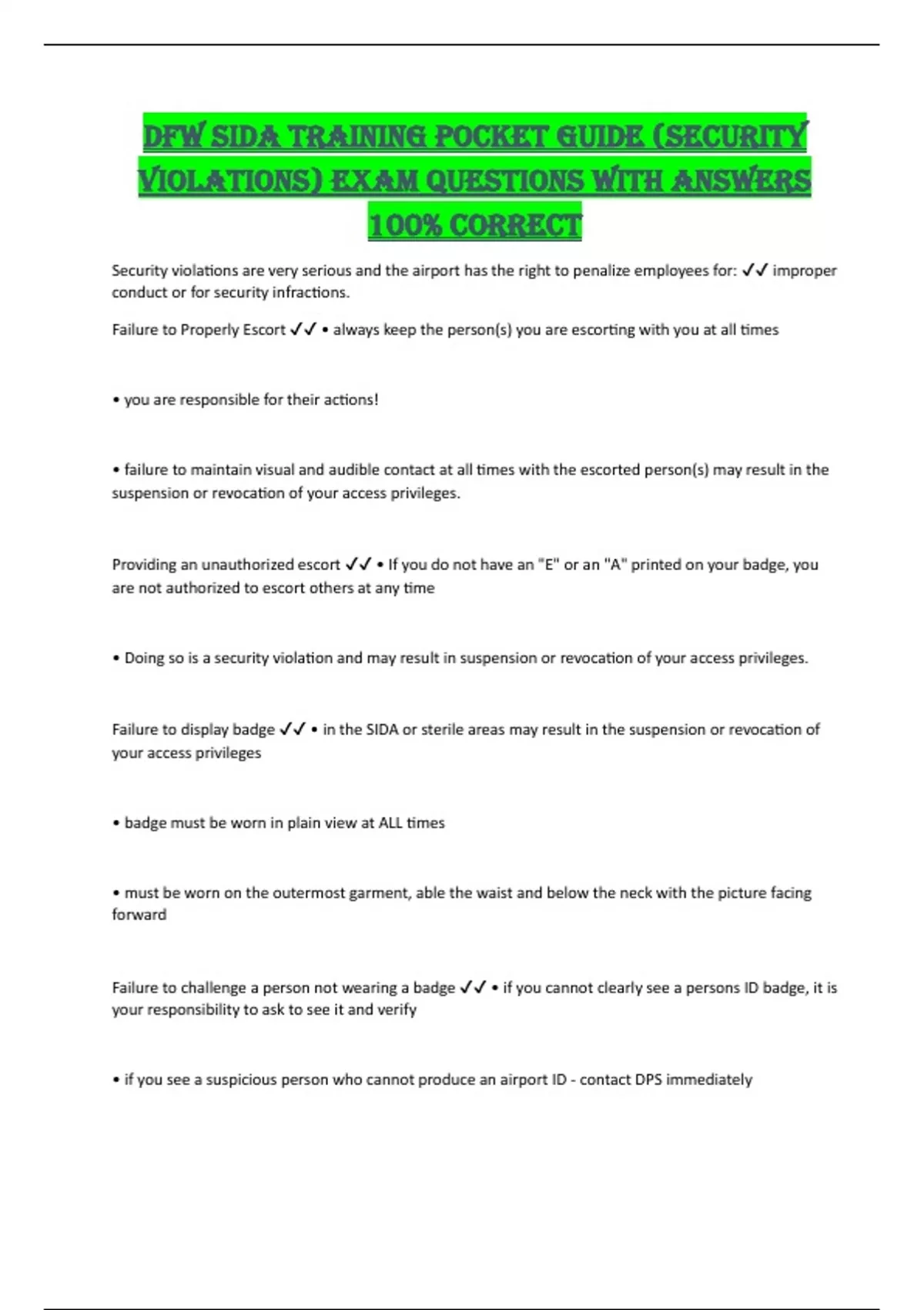 DFW SIDA Training Pocket Guide (Security Violations) Exam Questions with Answers 100% Correct