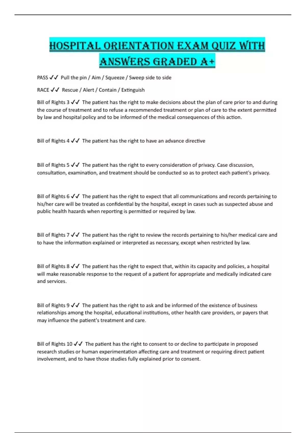Hospital Orientation Exam Quiz with Answers Graded A+