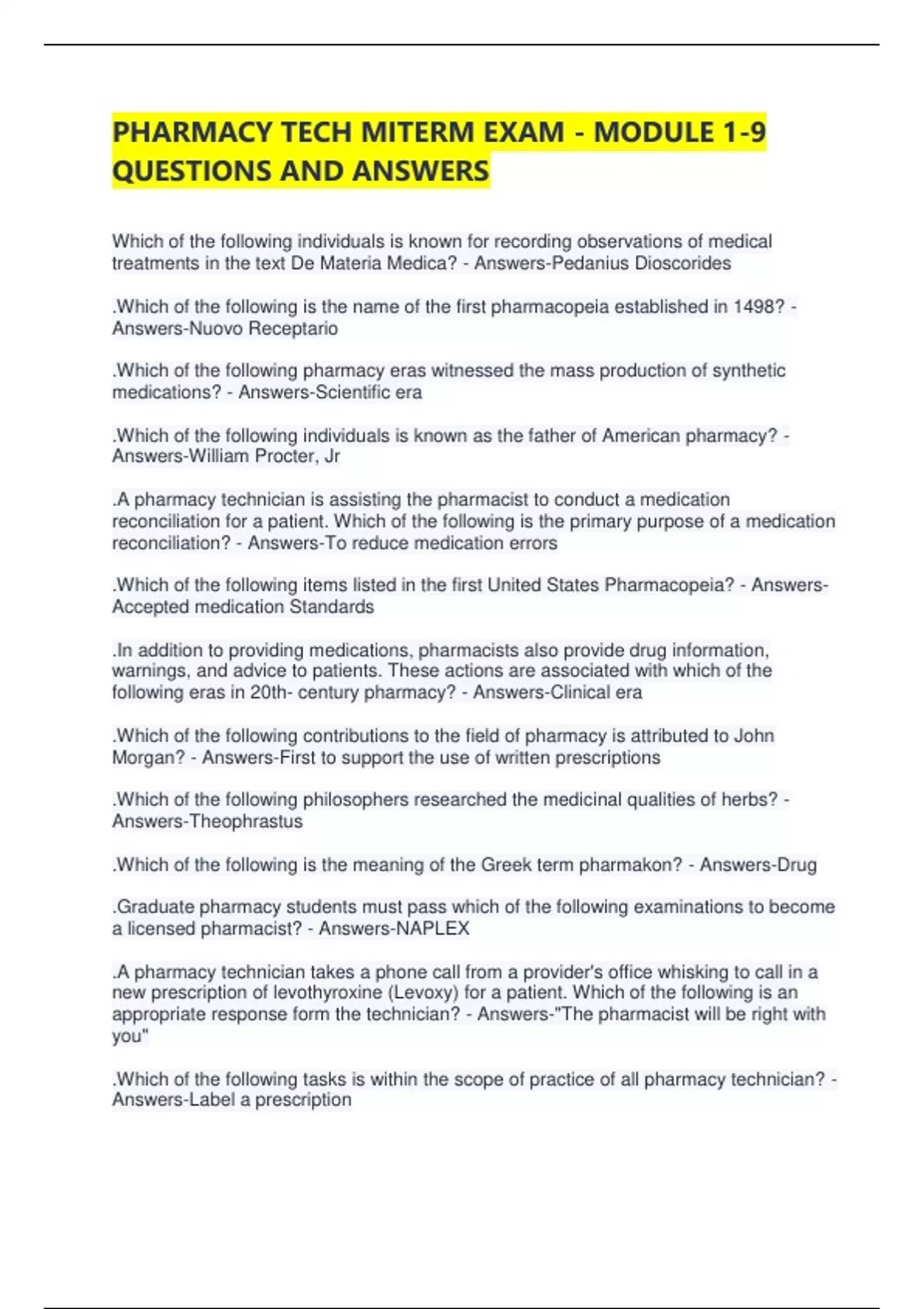 PHARMACY TECH MITERM EXAM - MODULE 1-9 QUESTIONS AND ANSWERS Which of the following individuals is known for recording observations of medical treatments in the text De Materia Medica? - Answers-Pedanius Dioscorides .Which of the following is the name of the first pharmacopeia established in 1498? - Answers-Nuovo Receptario .Which of the following pharmacy eras witnessed the mass production of synthetic medications? - Answers-Scientific era .Which of the following individuals is known as the father of American pharmacy? - Answers-William Procter, Jr .A pharmacy technician is assisting the pharmacist to conduct a medication reconciliation for a patient. Which of the following is the primary purpose of a medication reconciliation? - Answers-To reduce medication errors .Which of the following items listed in the first United States Pharmacopeia? - Answers-Accepted medication Standards .In addition to providing medications, pharmacists also provide drug information, warnings, and advice to patients. These actions are associated with which of the following eras in 20th- century pharmacy? - Answers-Clinical era .Which of the following contributions to the field of pharmacy is attributed to John Morgan? - Answers-First to support the use of written prescriptions .Which of the following philosophers researched the medicinal qualities of herbs? - Answers-Theophrastus .Which of the following is the meaning of the Greek term pharmakon? - Answers-Drug .Graduate pharmacy students must pass which of the following examinations to become a licensed pharmacist? - Answers-NAPLEX .A pharmacy technician takes a phone call from a provider's office whisking to call in a new prescription of levothyroxine (Levoxy) for a patient. Which of the following is an appropriate response form the technician? - Answers-"The pharmacist will be right with you" .Which of the following tasks is within the scope of practice of all pharmacy technician? - Answers-Label a prescription