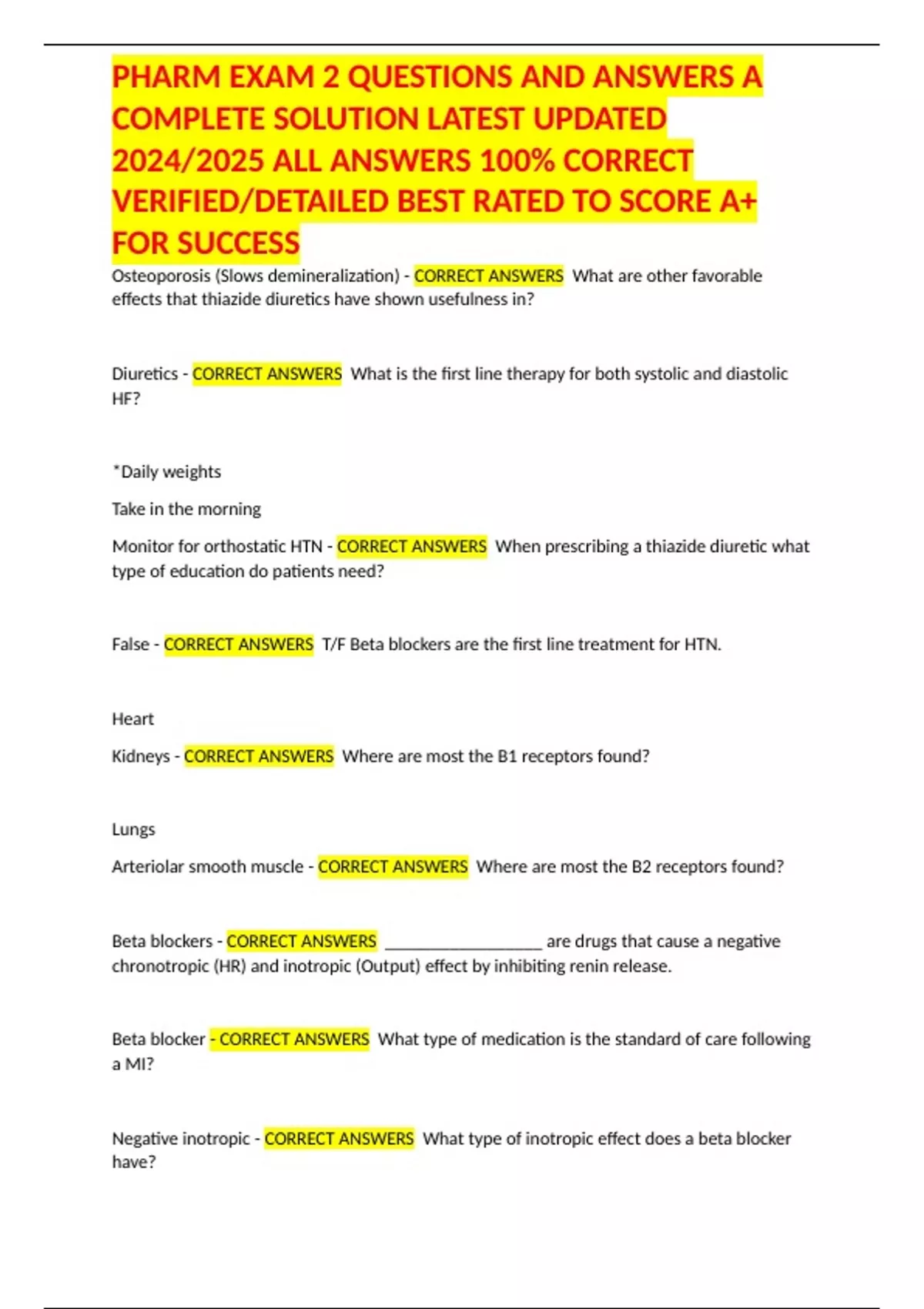 , PHARM EXAM 2 QUESTIONS AND ANSWERS A