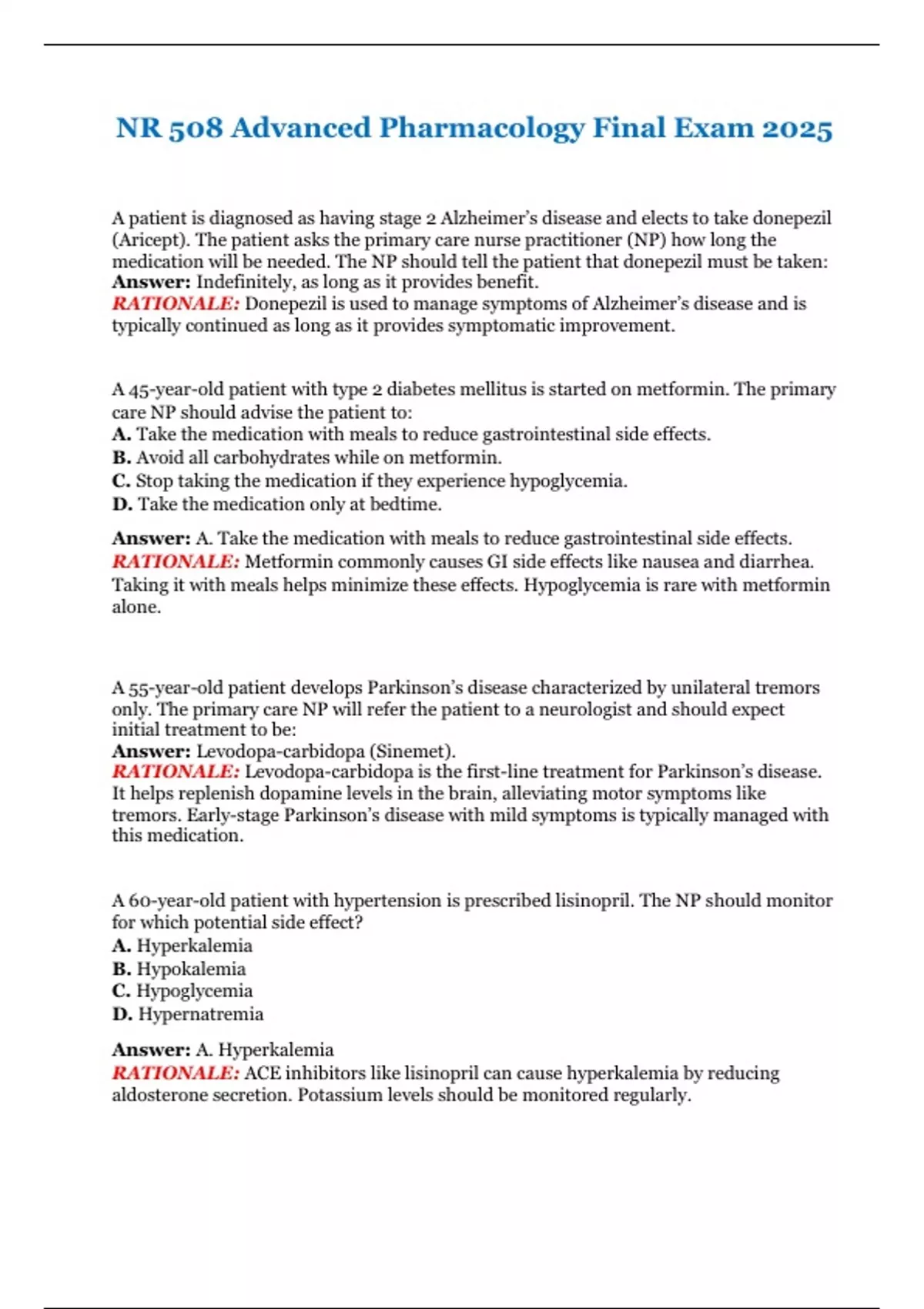 A patient is diagnosed as having stage 2 Alzheimer’s disease and elects to take donepezil