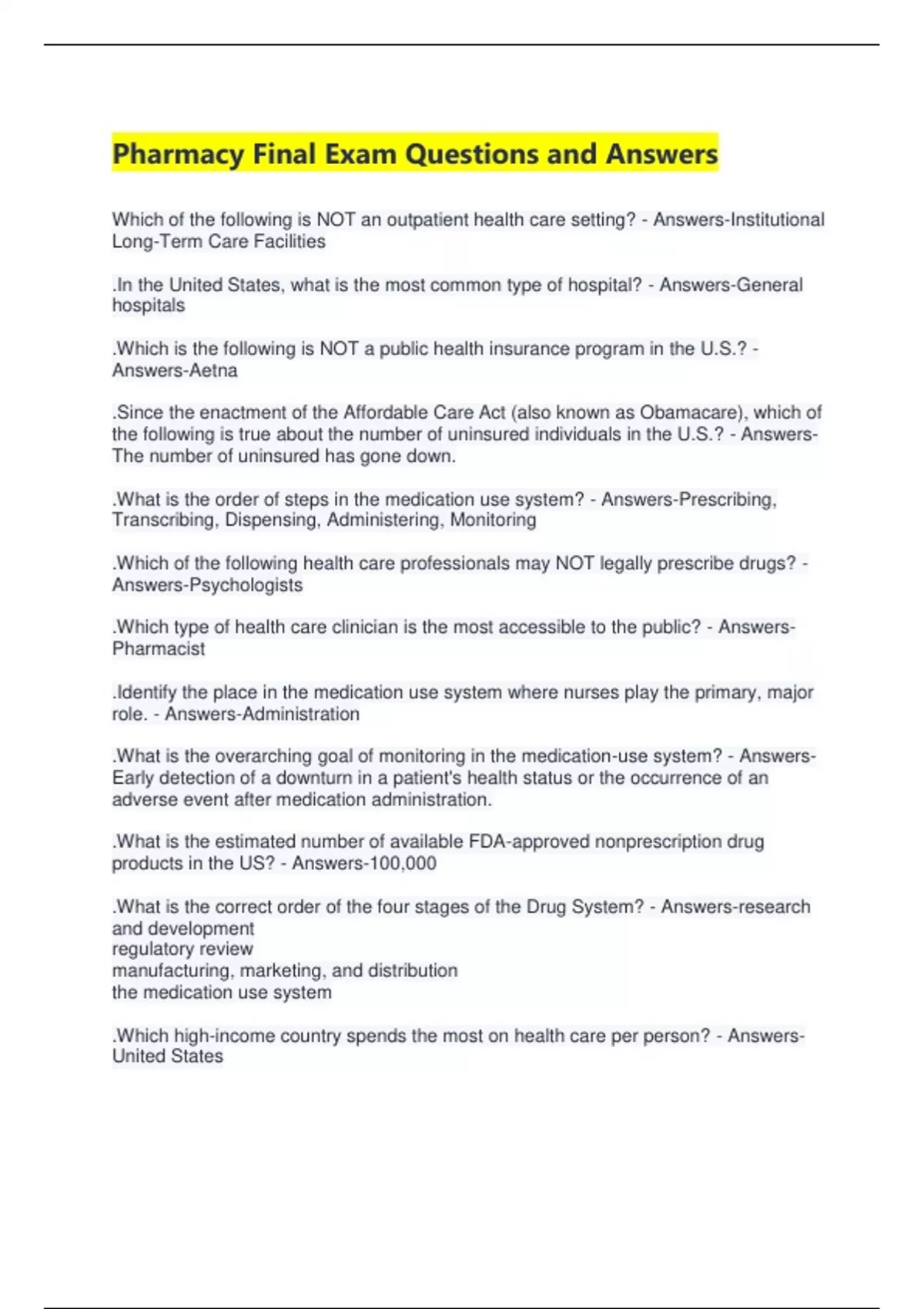 Pharmacy Final Exam Questions and Answers Which of the following is NOT an outpatient health care setting? - Answers-Institutional Long-Term Care Facilities .In the United States, what is the most common type of hospital? - Answers-General hospitals .Which is the following is NOT a public health insurance program in the U.S.? - Answers-Aetna .Since the enactment of the Affordable Care Act (also known as Obamacare), which of the following is true about the number of uninsured individuals in the U.S.? - Answers-The number of uninsured has gone down. .What is the order of steps in the medication use system? - Answers-Prescribing, Transcribing, Dispensing, Administering, Monitoring .Which of the following health care professionals may NOT legally prescribe drugs? - Answers-Psychologists .Which type of health care clinician is the most accessible to the public? - Answers-Pharmacist .Identify the place in the medication use system where nurses play the primary, major role. - Answers-Administration .What is the overarching goal of monitoring in the medication-use system? - Answers-Early detection of a downturn in a patient's health status or the occurrence of an adverse event after medication administration. .What is the estimated number of available FDA-approved nonprescription drug products in the US? - Answers-100,000 .What is the correct order of the four stages of the Drug System? - Answers-research and development regulatory review manufacturing, marketing, and distribution the medication use system .Which high-income country spends the most on health care per person? - Answers-United States .Which of the following is an example of an inpatient health care setting? - Answers-Institutional Long-Term Care Facilities .Which of the following long-term care settings has the highest level of nursing care? - Answers-Skilled nursing facilities .What is the definition of moral hazard with respect to healthcare? - Answers-Consumer behavior that leads to a higher utilization of health care services when they are covered by insurance. .Which type of Managed Care Plan requires enrollees to stay within a network of providers and obtain a referral to see a specialist? - Answers-Health Maintenance Organizations (HMO) .What is the insurance term for a fee you pay monthly (like a membership fee) even if you don't use any health care services in that month? - Answers-Premium .Which is the following is NOT a public health insurance program in the U.S.? - Answers-Nationwide Mutual Insurance .What is a pharmacy benefit manager (PBM)? - Answers-A third-party administrator of prescription drug plans that negotiates better drug prices for the insurance plans and helps to control drug spending .Which of the following is required to be included on every prescription written in the United States? - Answers-Patient name .In which step of the medication use system do the most medical errors occur? - Answers-Medication Administration .What is prescriptive authority? - Answers-The ability to legally prescribe prescription and controlled drugs. .Which of the following health care professionals can prescribe drugs without restrictions? - Answers-Osteopathic Physician .Which step in the medication use system does CPOE eliminate? - Answers-Transcribing .Pharmacist currently must complete what level of education to practice in the United States? - Answers-Doctorate .Pharmaceutical care involves ensuring that a patient's medications is/are: - Answers-safe effective warranted used correctly .List a major site of employment for pharmacists - Answers-Hospitals .What is a collaborative practice agreement? - Answers-A formal relationship between pharmacists and physicians or other providers that allows a pharmacist to provide expanded services such as adjusting or refilling medications. .Most states now maintain databases of controlled substance prescribing to prevent their abuse, such as ___________ in Ohio. - Answers-Ohio Automated RX Reporting System .8 rights of medical administration - Answers-Right patient Right medication Right dose Right route Right time Right documentation Right reason Right response .Which 2 activities may be performed by a nursing aide? - Answers-Bathing and taking vital signs .Which of the following routes of administration is an example of enteral administration? - Answers-rectal .Listed below are several reasons for hospitals to use barcode medication administration. Which reason is the most important? - Answers-Improves patient safety by preventing errors .List one potential benefit for the use of an automated dispensing cabinet. - Answers-Increased security measures Reduce medication error rate Decreased delivery turnaround time Ensure greater control of charge capture (information for billing the patient) They provide nurses with near total access of medications needed in patient care areas .What are the two most common medication errors? - Answers-Wrong medicine and wrong dose .Reporting medication errors to at least one Adverse Event Reporting System is mandatory for all hospital errors occurring in the United States. - Answers-false