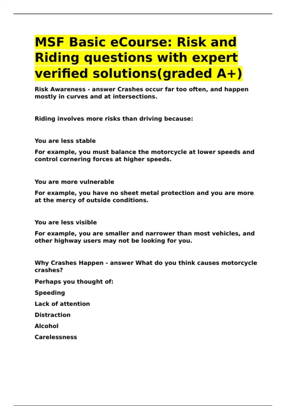 MSF Basic eCourse Risk and Riding questions with expert verified solutions(graded A+).