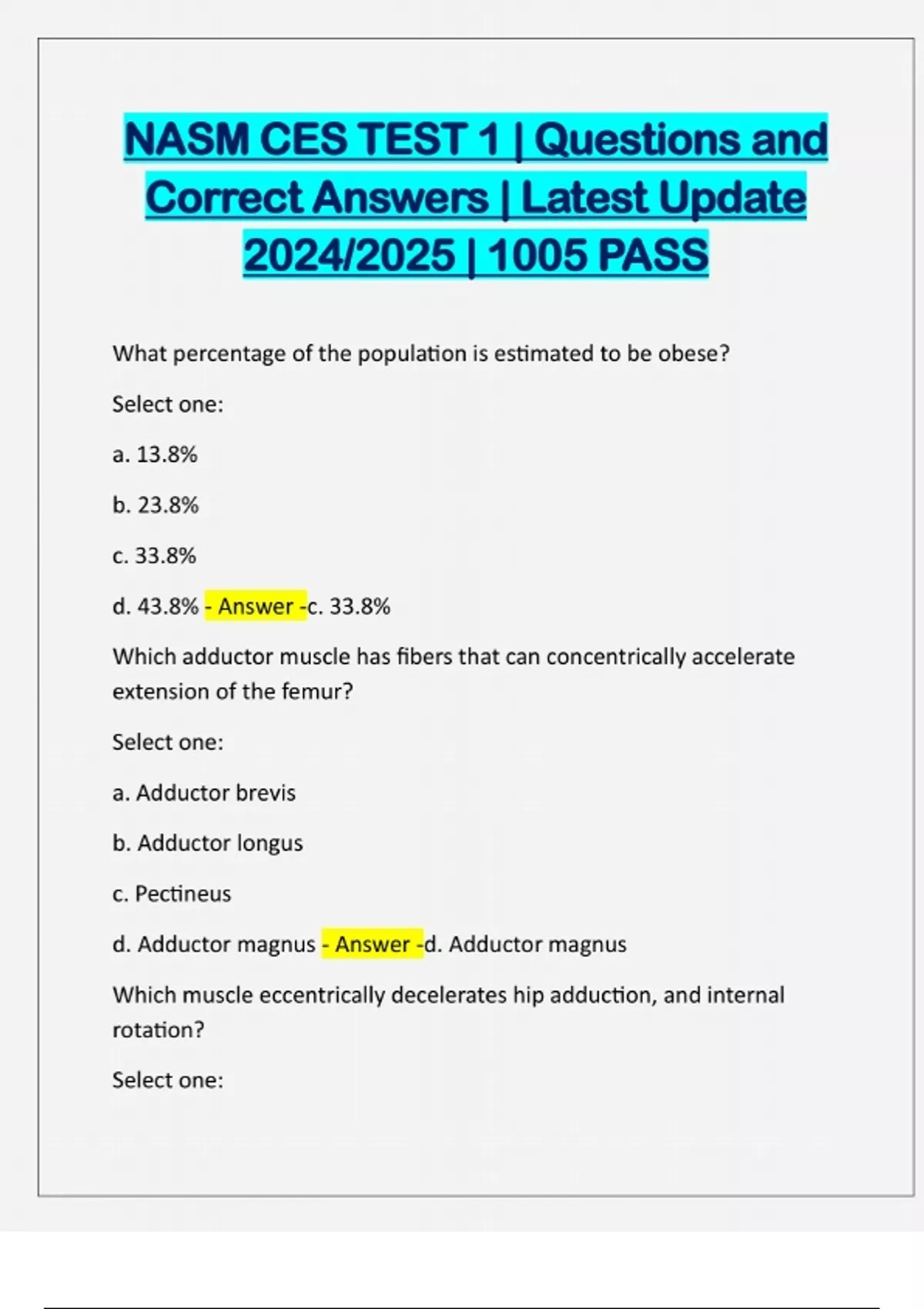 NASM CES TEST 1 | Questions and Correct Answers | Latest Update 2024/2025 | 1005 PASS What percentage of the population is estimated to be obese? Select one: a. 13.8% b. 23.8% c. 33.8% d. 43.8% - Answer -c. 33.8% Which adductor muscle has fibers that can concentrically accelerate extension of the femur? Select one: a. Adductor brevis b. Adductor longus c. Pectineus d. Adductor magnus - Answer -d. Adductor magnus Which muscle eccentrically decelerates hip adduction, and internal rotatio