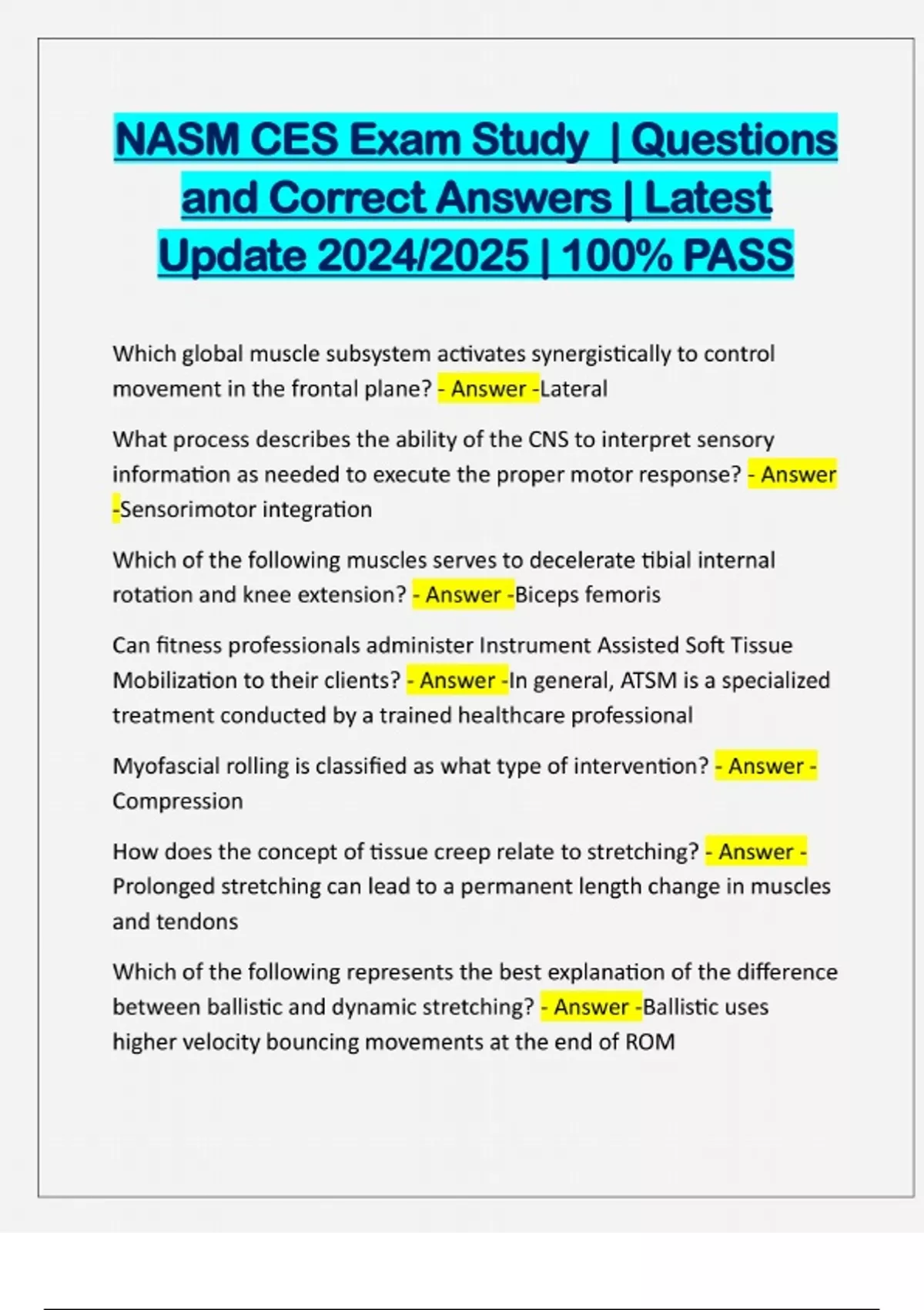 NASM CES Exam Study | Questions and Correct Answers | Latest Update 2024/2025 | 100% PASS