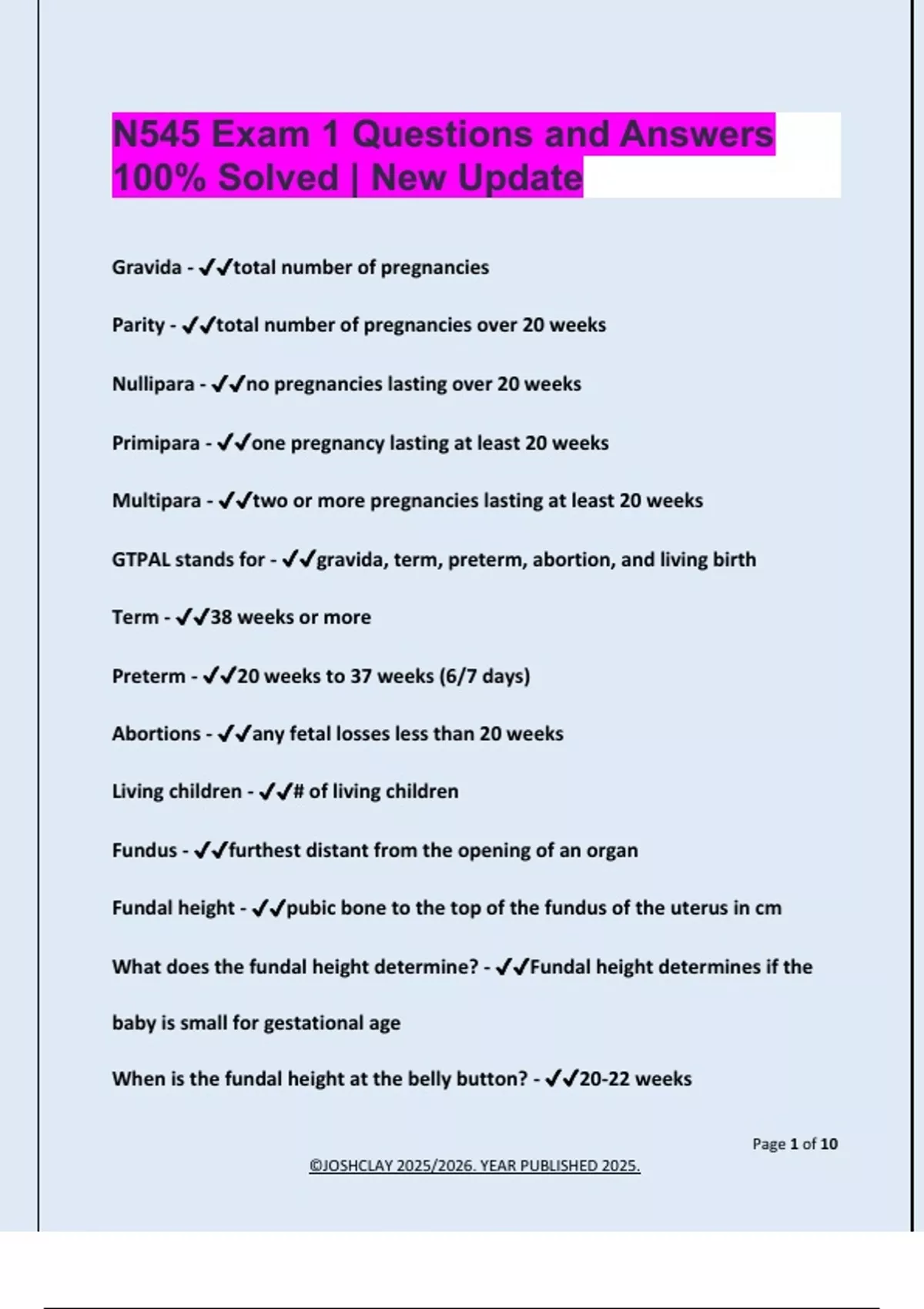 N545 Exam 1 Questions and Answers 100% Solved | New Update Gravida - total number of pregnancies Parity - total number of pregnancies over 20 weeks Nullipara - no pregnancies lasting over 20 weeks Primipara - one pregnancy lasting at least 20 weeks Multipara - two or more pregnancies lasting at least 20 weeks GTPAL stands for - gravida, term, preterm, abortion, and living birth Term - 38 weeks or more Preterm - 20 weeks to 37 weeks (6/7 days) Abortions - any fetal losses less than 20 weeks Living children - # of living children Fundus - furthest distant from the opening of an organ Fundal height - pubic bone to the top of the fundus of the uterus in cm What does the fundal height determine? - Fundal height determines if the baby is small for gestational age When is the fundal height at the belly button? - 20-22 weeks