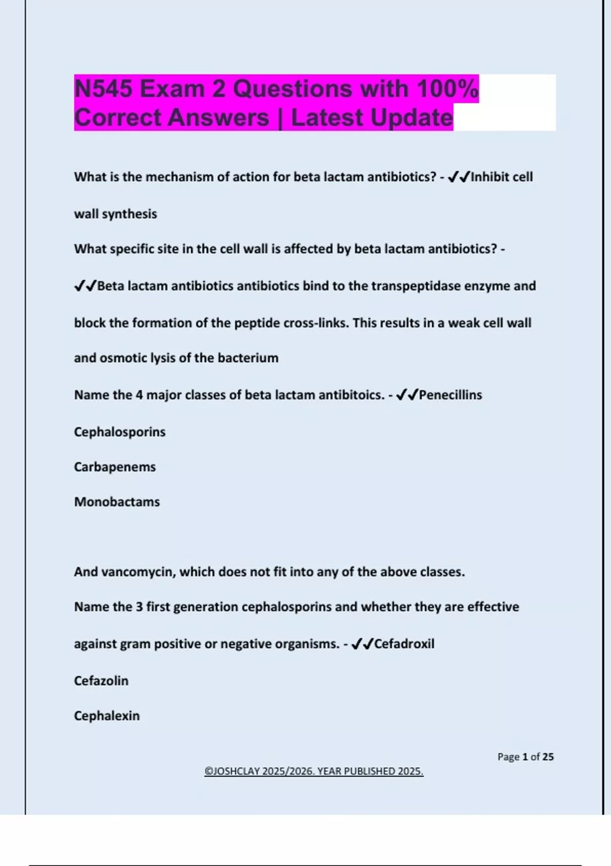 N545 Exam 2 Questions with 100% Correct Answers | Latest Update What is the mechanism of action for beta lactam antibiotics? - Inhibit cell wall synthesis What specific site in the cell wall is affected by beta lactam antibiotics? - Beta lactam antibiotics antibiotics bind to the transpeptidase enzyme and block the formation of the peptide cross-links. This results in a weak cell wall and osmotic lysis of the bacterium Name the 4 major classes of beta lactam antibitoics. - Penecillins Cephalosporins Carbapenems Monobactams And vancomycin, which does not fit into any of the above classes. Name the 3 first generation cephalosporins and whether they are effective against gram positive or negative organisms. - Cefadroxil Cefazolin Cephalexin