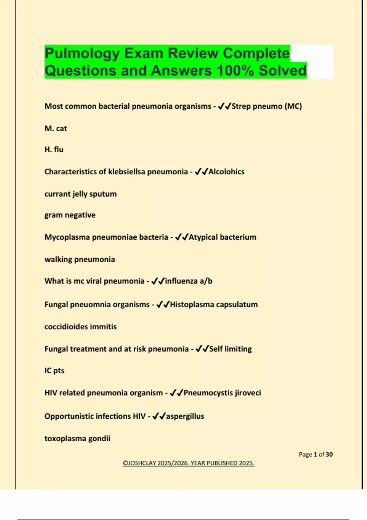 Pulmology Exam Review Complete Questions and Answers 100% Solved Most common bacterial pneumonia organisms - Strep pneumo (MC) M. cat H. flu Characteristics of klebsiellsa pneumonia - Alcolohics currant jelly sputum gram negative Mycoplasma pneumoniae bacteria - Atypical bacterium walking pneumonia What is mc viral pneumonia - influenza a/b Fungal pneuomnia organisms - Histoplasma capsulatum coccidioides immitis Fungal treatment and at risk pneumonia - Self limiting IC pts HIV related pneumonia organism - Pneumocystis jiroveci Opportunistic infections HIV - aspergillus toxoplasma gondi