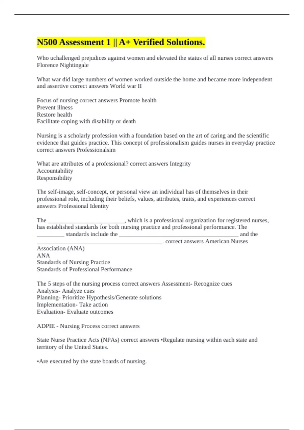 State Nurse Practice Acts (NPAs) correct answers •Regulate nursing within each state and