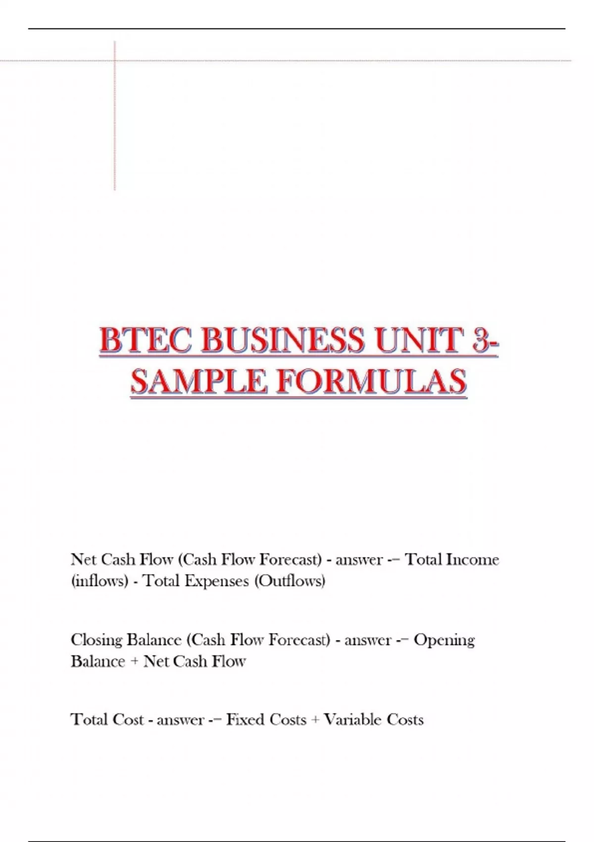 BTEC BUSINESS UNIT 3- SAMPLE FORMULAS