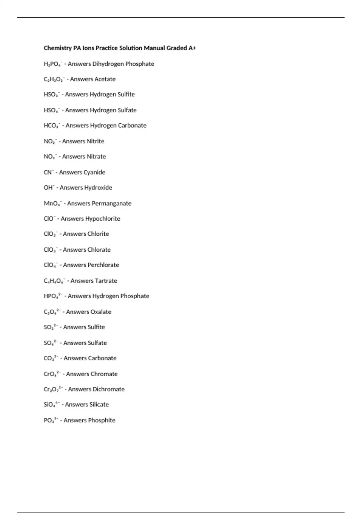 Chemistry PA Ions Practice Solution Manual Graded A+ H₂PO₄⁻ - Answers Dihydrogen Phosphate C₂H₃O₂⁻ - Answers Acetate HSO₃⁻ - Answers Hydrogen Sulfite HSO₄⁻ - Answers Hydrogen Sulfate HCO₃⁻ - Answers Hydrogen Carbonate NO₂⁻ - Answers Nitrite NO₃⁻ - Answers Nitrate CN⁻ - Answers Cyanide OH⁻ - Answers Hydroxide MnO₄⁻ - Answers Permanganate ClO⁻ - Answers Hypochlorite ClO₂⁻ - Answers Chlorite ClO₃⁻ - Answers Chlorate ClO₄⁻ - Answers Perchlorate C₄H₄O₆⁻ - Answers Tartrate HPO₄²⁻ - Answers Hydrogen Phosphate