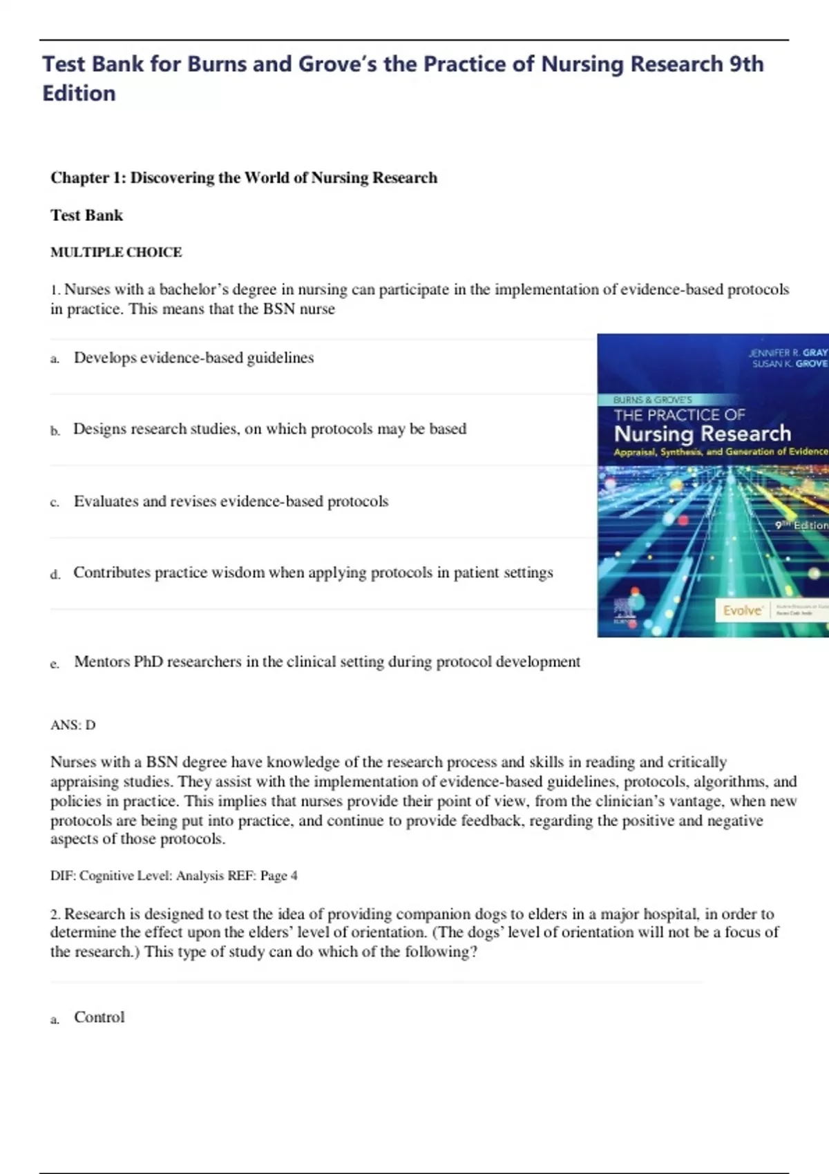 Test Bank for Burns and Grove’s the Practice of Nursing Research 9th Edition
