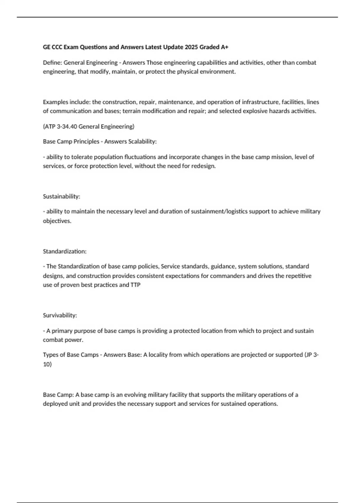 GE CCC Exam Questions and Answers Latest Update 2025 Graded A+ Define: General Engineering - Answers Those engineering capabilities and activities, other than combat engineering, that modify, maintain, or protect the physical environment. Examples include: the construction, repair, maintenance, and operation of infrastructure, facilities, lines of communication and bases; terrain modification and repair; and selected explosive hazards activities. (ATP 3-34.40 General Engineering) Base Camp Principles - Answers Scalability: - ability to tolerate population fluctuations and incorporate changes in the base camp mission, level of services, or force protection level, without the need for redesign. Sustainability: - ability to maintain the necessary level and duration of sustainment/logistics support to achieve military objectives. Standardization: - The Standardization of base camp policies, Service standards, guidance, system solutions, standard designs, and construction provides consistent expectations for commanders and drives the repetitive use of proven best practices and TTP Survivability: - A primary purpose of base camps is providing a protected location from which to project and sustain combat power. Types of Base Camps - Answers Base: A locality from which operations are projected or supported (JP 3-10) Base Camp: A base camp is an evolving military facility that supports the military operations of a deployed unit and provides the necessary support and services for sustained operations.