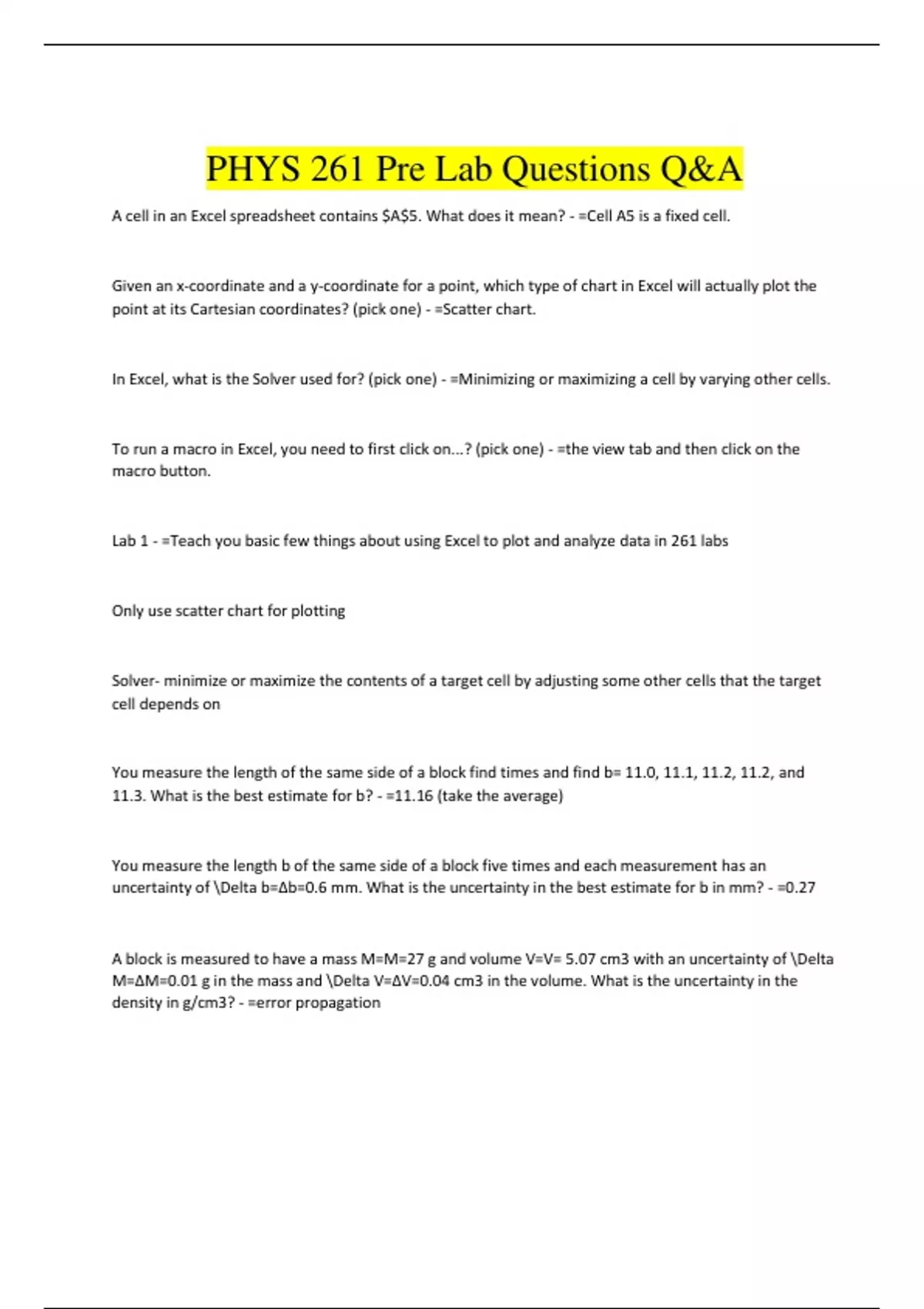 Lab 1 - =Teach you basic few things about using Excel to plot and analyze data in 261 labs