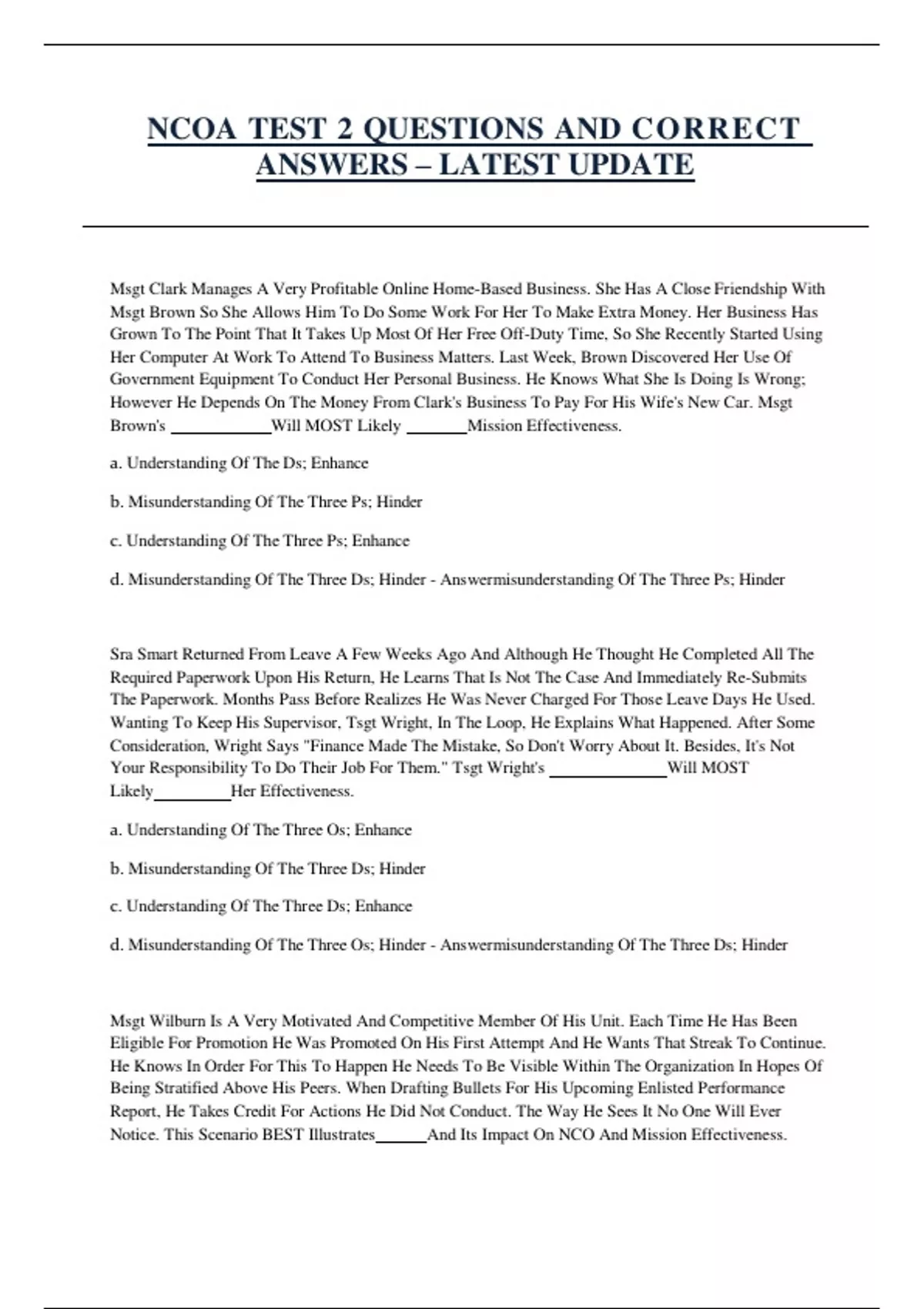 NCOA TEST 2 QUESTIONS AND CORRECT