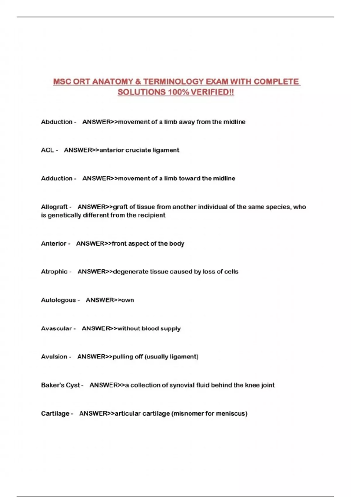 MSC ORT ANATOMY & TERMINOLOGY EXAM WITH COMPLETE SOLUTIONS 100% VERIFIED!!...