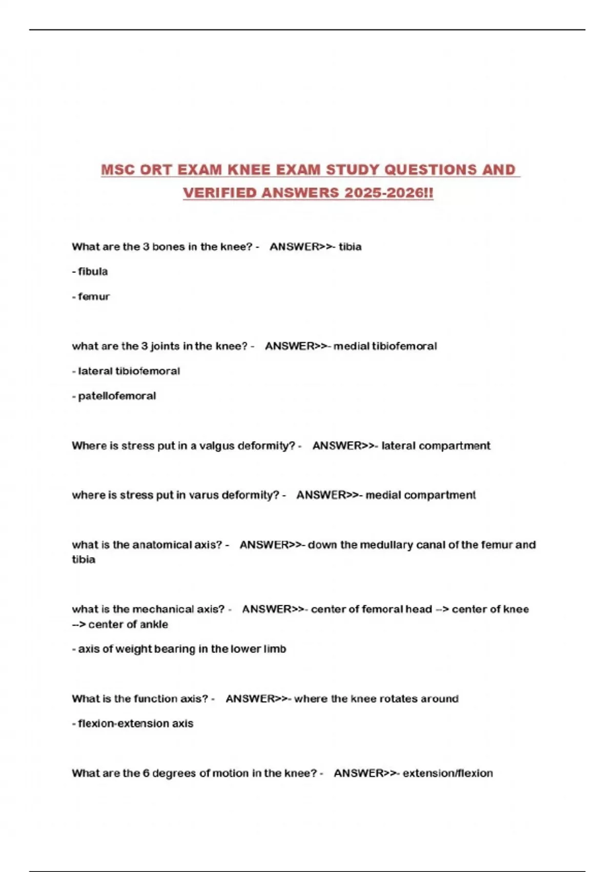 MSC ORT KNEE EXAM STUDY QUESTIONS AND VERIFIED ANSWERS !!...
