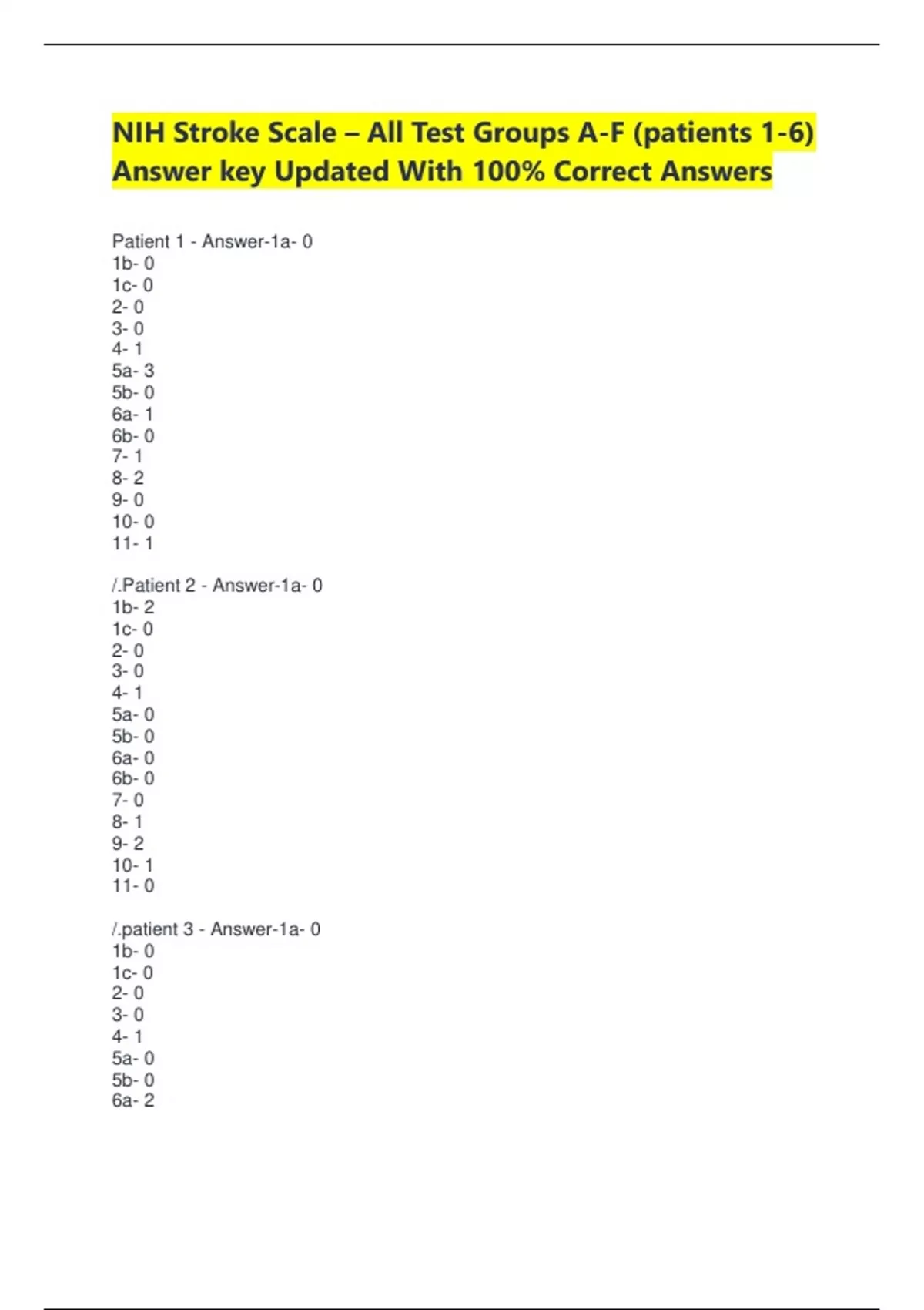 NIH Stroke Scale – All Test Groups A-F (patients 1-6) Answer key Updated With 100% Correct Answers Patient 1 - Answer-1a- 0 1b- 0 1c- 0 2- 0 3- 0 4- 1 5a- 3 5b- 0 6a- 1 6b- 0 7- 1 8- 2 9- 0 10- 0 11- 1 /.Patient 2 - Answer-1a- 0 1b- 2 1c- 0 2- 0 3- 0 4- 1 5a- 0 5b- 0 6a- 0 6b- 0 7- 0 8- 1 9- 2 10- 1 11- 0 /.patient 3 - Answer-1a- 0 1b- 0 1c- 0 2- 0 3- 0 4- 1 5a- 0