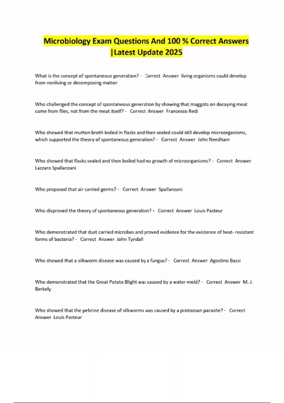 Microbiology Exam Questions And 100 % Correct Answers |Latest Update 2025 What is the concept of spontaneous generation? - Correct Answer living organisms could develop from nonliving or decomposing matter Who challenged the concept of spontaneous generation by showing that maggots on decaying meat came from flies, not from the meat itself? - Correct Answer Francesco Redi Who showed that mutton broth boiled in flasks and then sealed could still develop microorganisms, which supported the theory of spontaneous generation? - Correct Answer John Needham Who showed that flasks sealed and then boiled had no growth of microorganisms? - Correct Answer Lazzaro Spallanzani Who proposed that air carried germs? - Correct Answer Spallanzani Who disproved the theory of spontaneous generation? - Correct Answer Louis Pasteur Who demonstrated that dust carried microbes and proved evidence for the existence of heat- resistant forms of bacteria? - Correct Answer John Tyndall Who showed that a silkworm disease was caused by a fungus? - Correct Answer Agostino Bassi Who demonstrated that the Great Potato Blight was caused by a water mold? - Correct Answer M. J. Berkely Who showed that the pebrine disease of silkworms was caused by a protozoan parasite? - Correct Answer Louis Pasteur Who developed a system of surgery designed to prevent microorganisms from entering wounds? - Correct Answer John Lister Who transformed the practice of surgery? - Correct Answer John Lister Who established the relationship between Bacillus anthracis and anthrax? - Correct Answer Robert Koch What are the Koch Postulates? - Correct Answer 1.The microorganisms must be present in every case of the disease but absent from healthy individuals 2.The suspected microorganisms must be isolated and grown in pure culture 3. The same disease must result when the isolated microorganism is inoculated into a healthy host 4. The same microorganism must be isolated again from the diseased host Limitations of Koch's Postulates - Correct Answer -Some organisms cannot be grown in pure culture -Using humans in completing the postulates is unethical -Molecular and genetic evidence may replace What vaccination did Edward Jenner make? - Correct Answer smallpox vaccination What vaccinations did Pasteur produce? - Correct Answer chicken cholera, rabies and anthrax Who induced formation of dipped toxin-antitoxins rabbits - Correct Answer Emil von Behring and Shibasaburo Kitasato Who showed that the silkworm disease was caused by fungus? - Correct Answer Bassi Who demonstrated that the Great Potato Blight of Ireland was caused by a water mold? - Correct Answer M.J. Berkeley