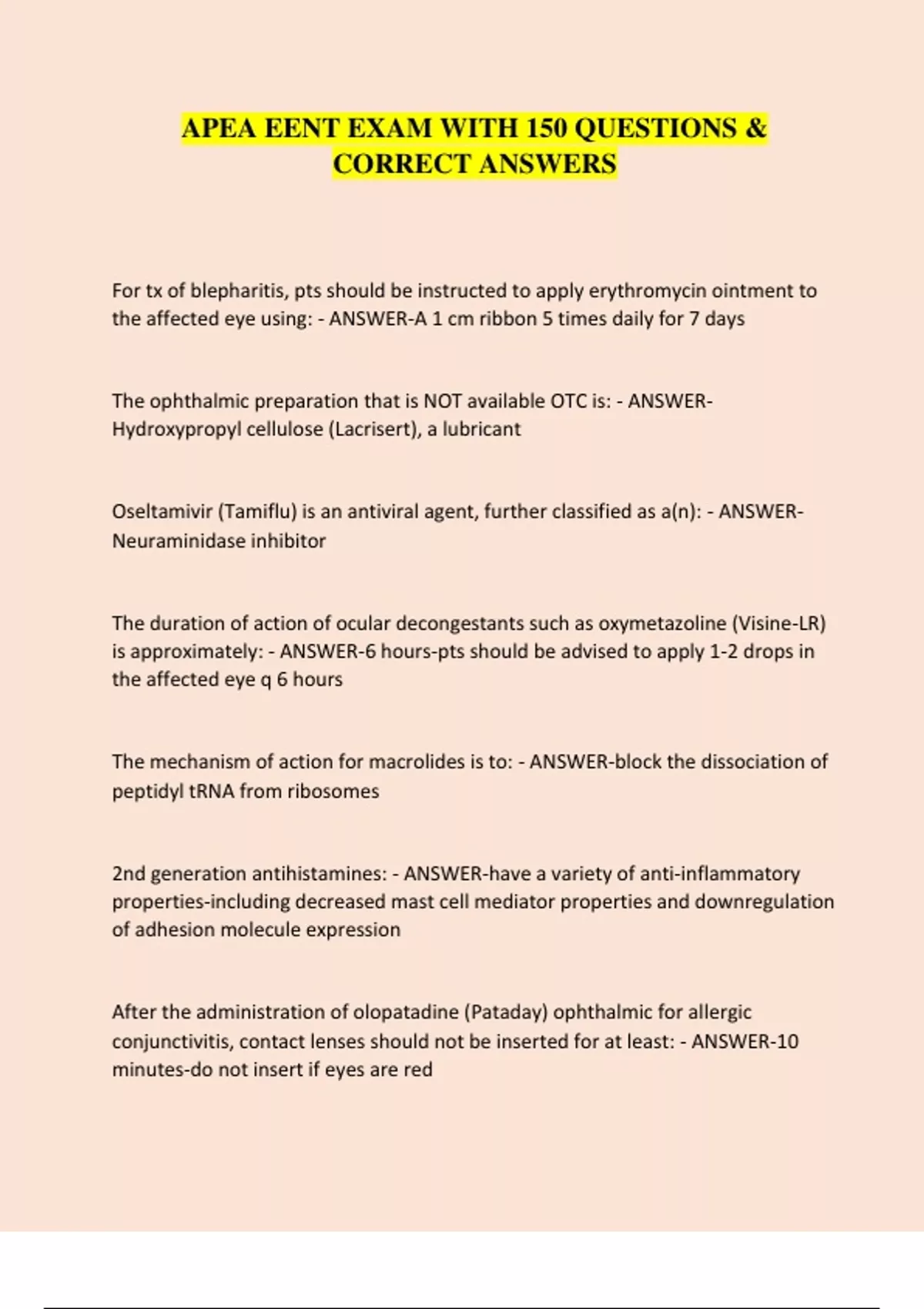 APEA EENT EXAM WITH 150 QUESTIONS & CORRECT ANSWERS