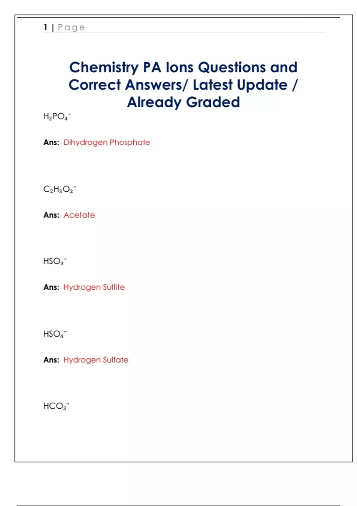 H₂PO₄⁻ Ans: Dihydrogen Phosphate C₂H₃O₂⁻ Ans: Acetate HSO₃⁻ Ans: Hydrogen Sulfite HSO₄⁻ Ans: Hydrogen Sulfate HCO₃⁻ 2 | P a g e Ans: Hydrogen Carbonate NO₂⁻ Ans: Nitrite NO₃⁻ Ans: Nitrate CN⁻ Ans: Cyanide OH⁻ Ans: Hydroxid