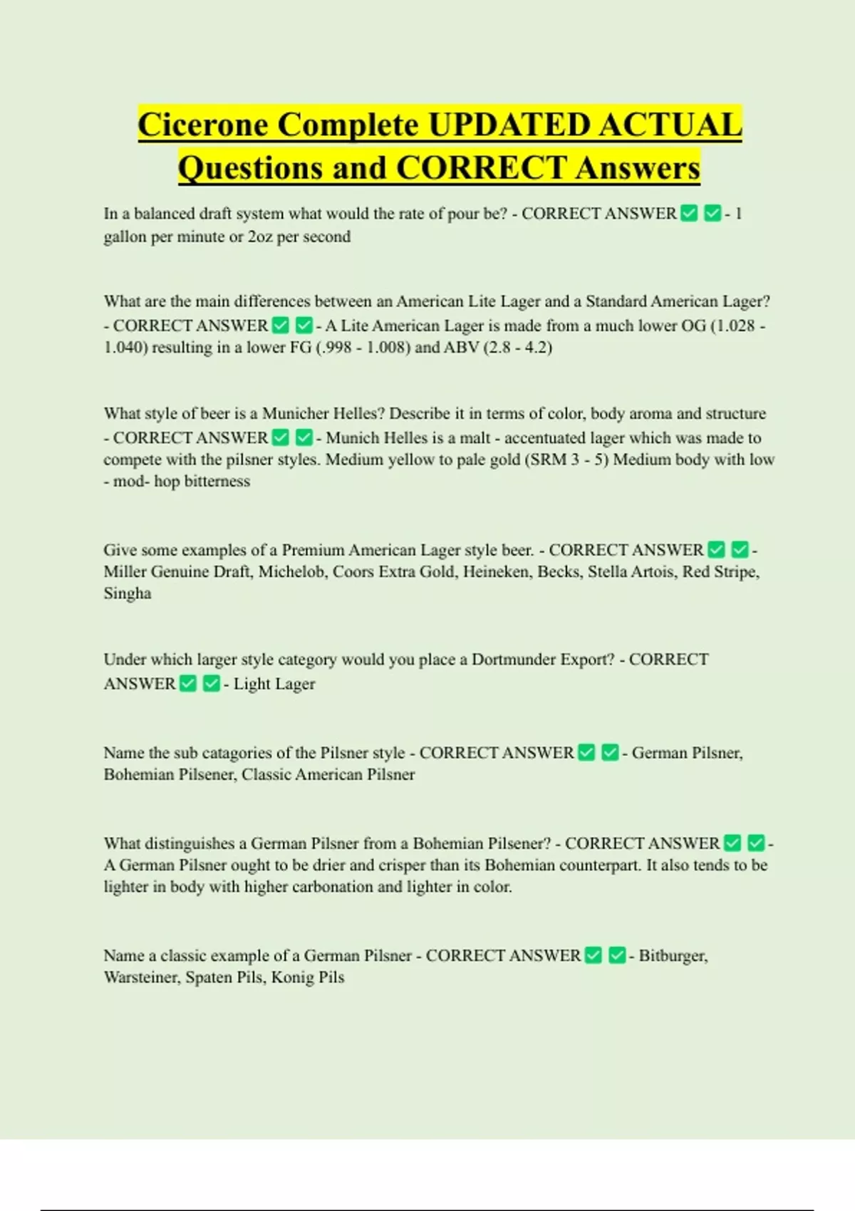 Cicerone Complete UPDATED ACTUAL Questions and CORRECT Answers In a balanced draft system what would the rate of pour be? - CORRECT ANSWER - 1 gallon per minute or 2oz per second What are the main differences between an American Lite Lager and a Standard American Lager? - CORRECT ANSWER - A Lite American Lager is made from a much lower OG (1.028 - 1.040) resulting in a lower FG (.998 - 1.008) and ABV (2.8 - 4.2)