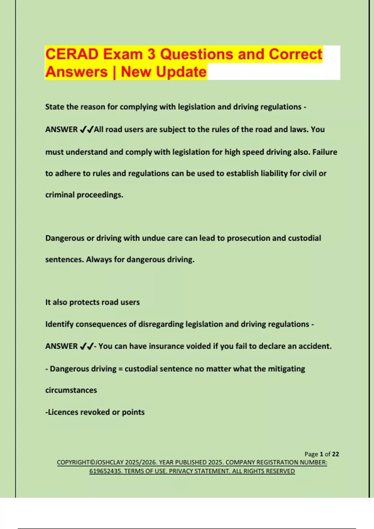 CERAD Exam 3 Questions and Correct Answers | New Update State the reason for complying with legislation and driving regulations - ANSWER All road users are subject to the rules of the road and laws. You must understand and comply with legislation for high speed driving also. Failure to adhere to rules and regulations can be used to establish liability for civil or criminal proceedings. Dangerous or driving with undue care can lead to prosecution and custodial sentences. Always for dangerous driving. It also protects road users Identify consequences of disregarding legislation and driving regulations - ANSWER - You can have insurance voided if you fail to declare an accident. - Dangerous driving = custodial sentence no matter what the mitigating circumstances -Licences revoked or points