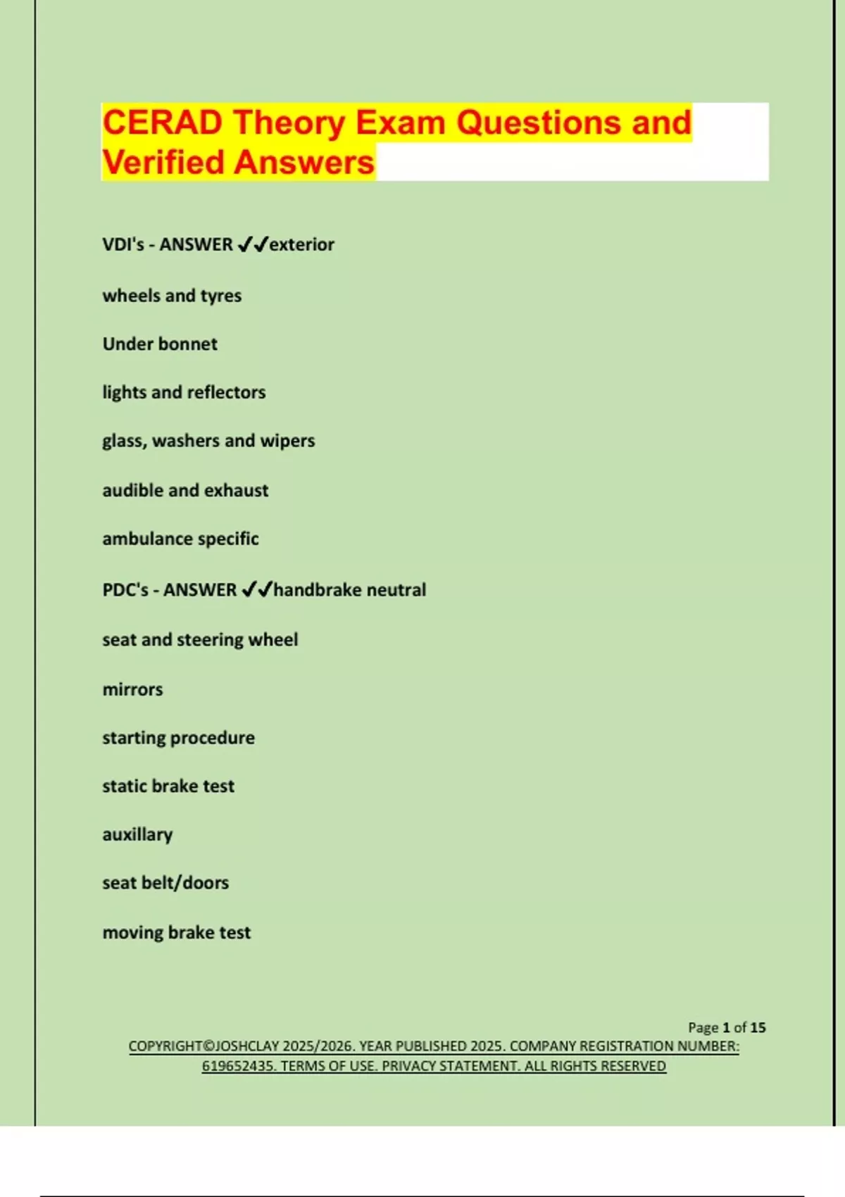 CERAD Theory Exam Questions and Verified Answers VDI's - ANSWER exterior wheels and tyres Under bonnet lights and reflectors glass, washers and wipers audible and exhaust ambulance specific PDC's - ANSWER handbrake neutral seat and steering wheel mirrors starting procedure static brake test auxillary seat belt/doors moving brake test