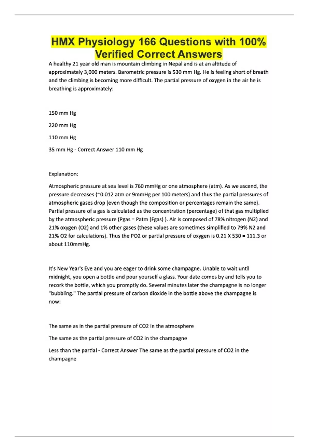 HMX Physiology 166 Questions with 100% Verified Correct Answers A healthy 21 year old man is mountain climbing in Nepal and is at an altitude of approximately 3,000 meters. Barometric pressure is 530 mm Hg. He is feeling short of breath and the climbing is becoming more difficult. The partial pressure of oxygen in the air he is breathing is approximately: 150 mm Hg 220 mm Hg 110 mm Hg 35 mm Hg - Correct Answer 110 mm Hg Explanation: Atmospheric pressure at sea level is 760 mmHg or one atmosphere (atm). As we ascend, the pressure decreases (~0.012 atm or 9mmHg per 100 meters) and thus the partial pressures of atmospheric gases drop (even though the composition or percentages remain the same). Partial pressure of a gas is calculated as the concentration (percentage) of that gas multiplied by the atmospheric pressure (Pgas = Patm (Fgas) ). Air is composed of 78% nitrogen (N2) and 21% oxygen (O2) and 1% other gases (these values are sometimes simplified to 79% N2 and 21% O2 for calculations). Thus the PO2 or partial pressure of oxygen is 0.21 X 530 = 111.3 or about 110mmHg. It's New Year's Eve and you are eager to drink some champagne. Unable to wait until midnight, you open a bottle and pour yourself a glass. Your date comes by and tells you to recork the bottle, which you promptly do. Several minutes later the champagne is no longer "bubbling." The partial pressure of carbon dioxide in the bottle above the champagne is now: The same as in the partial pressure of CO2 in the atmosphere The same as the partial pressure of CO2 in the champagne Less than the partial - Correct Answer The same as the partial pressure of CO2 in the champagne Explanation: Carbon dioxide (CO2) is dissolved in solution under high pressures as in a champagne bottle. When the cork is removed the high pressure in the bottle begins to equalize with atmospheric pressure outside the bottle. As the pressure rapidly decreases in the bottle, CO2 begins to come out of solution and is represented as bubbles. When the cork is reinserted into the bottle, CO2 coming out of solution begins to accumulate as a gas in the bottle and the PCO2 in the gaseous state increases. When the bubbling ceases, the partial pressure of CO2 in the gaseous state in the bottle equals the PCO2 dissolved in the liquid (champagne). Consequently, the PCO2 in the bottle is greater than the PCO2 in the atmosphere (where it is essentially zero). We cannot know with certainty how much greater the PCO2 is in the gaseous phase in the bottle compared to the atmosphere. Imagine you are on the planet Venus where the atmospheric pressure is ~92 atm (1 atm = 760 mmHg). What are the partial pressures of the component atmospheric gases, given gas fractions of 96.5% CO2 and 3.5% N2? PCO2 96.5 atm; PN2 3.