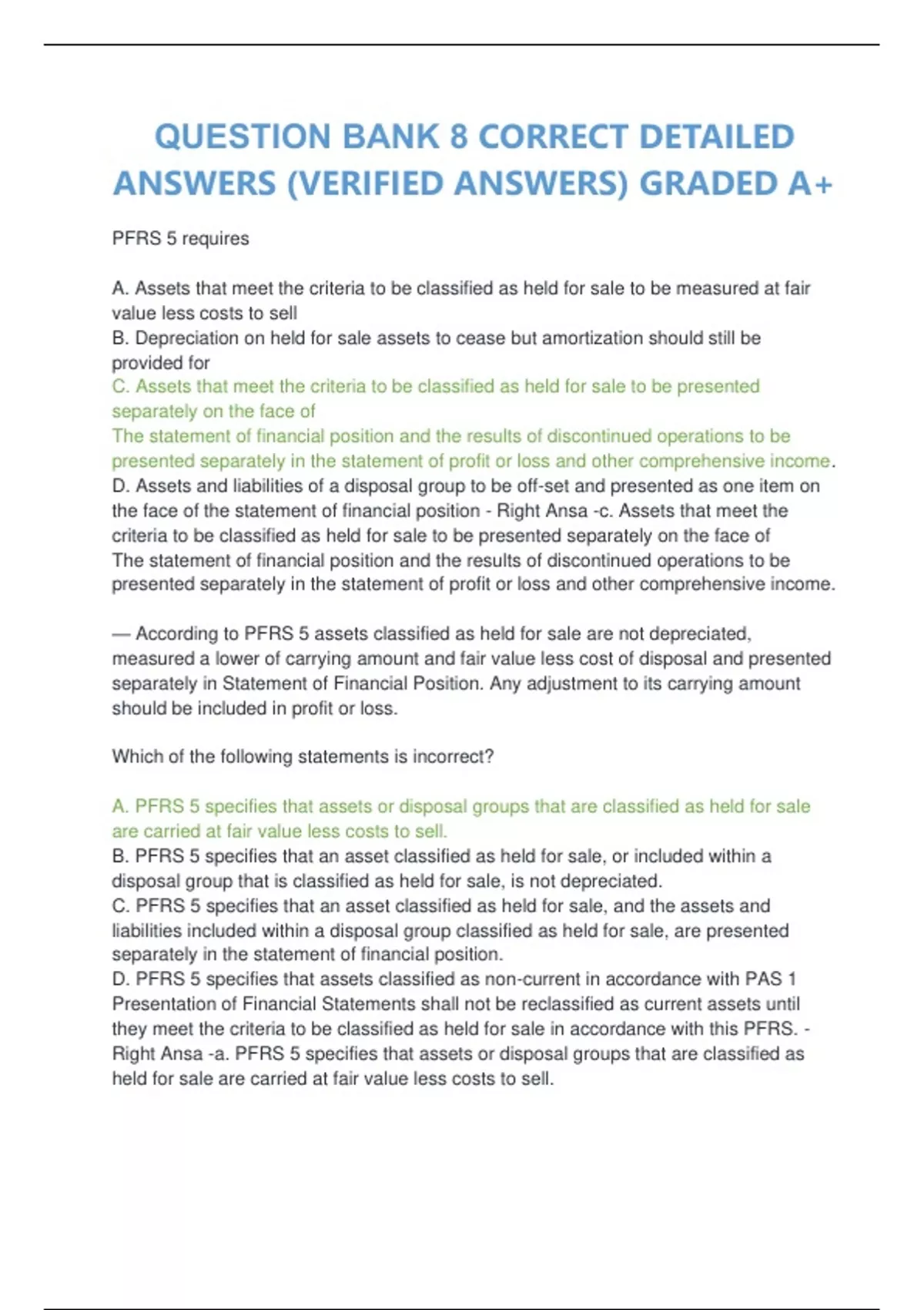 Right Ansa -a. PFRS 5 specifies that assets or disposal groups that are classified as