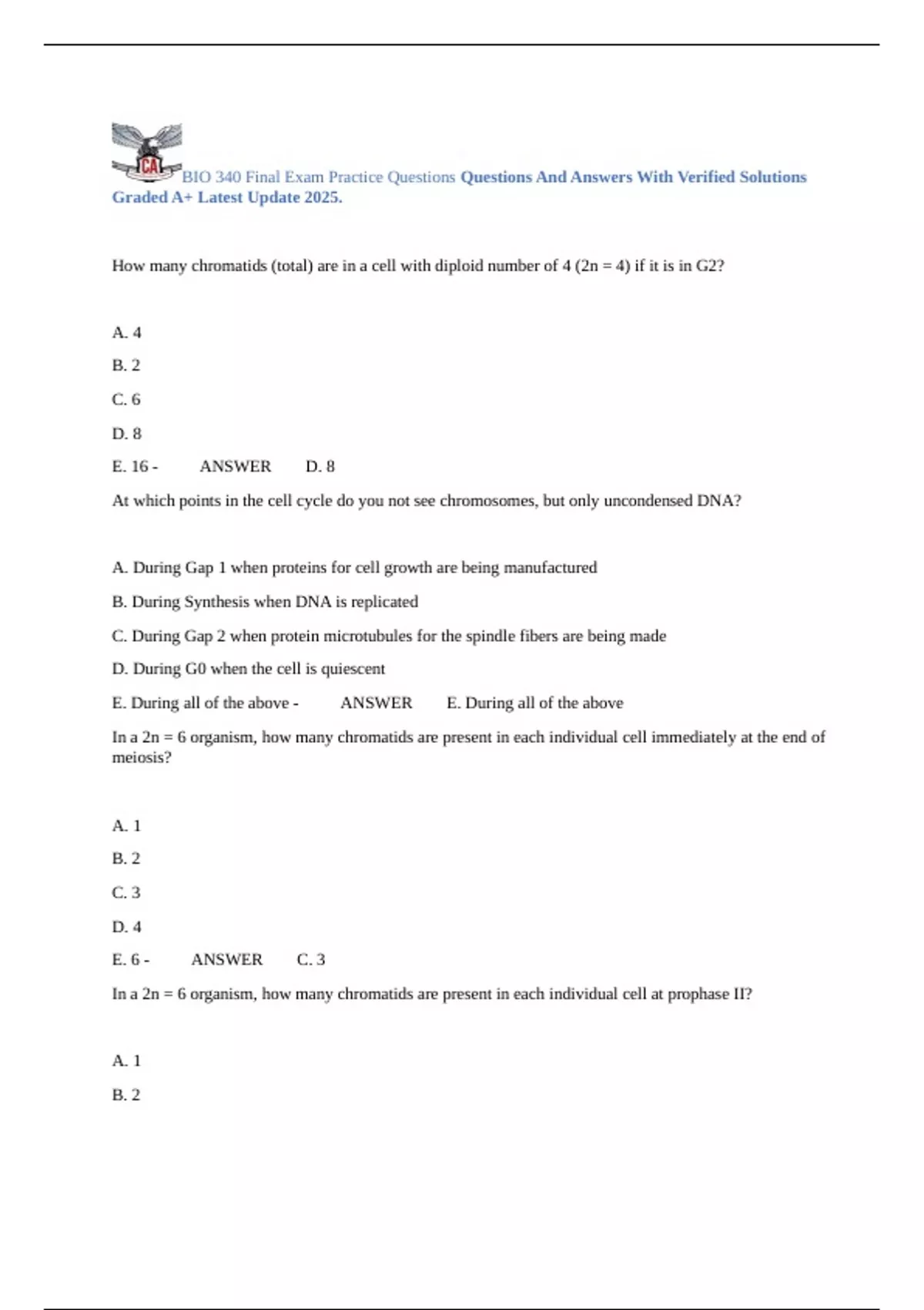 BIO 340 Final Exam Practice Questions Questions And Answers With Verified Solutions