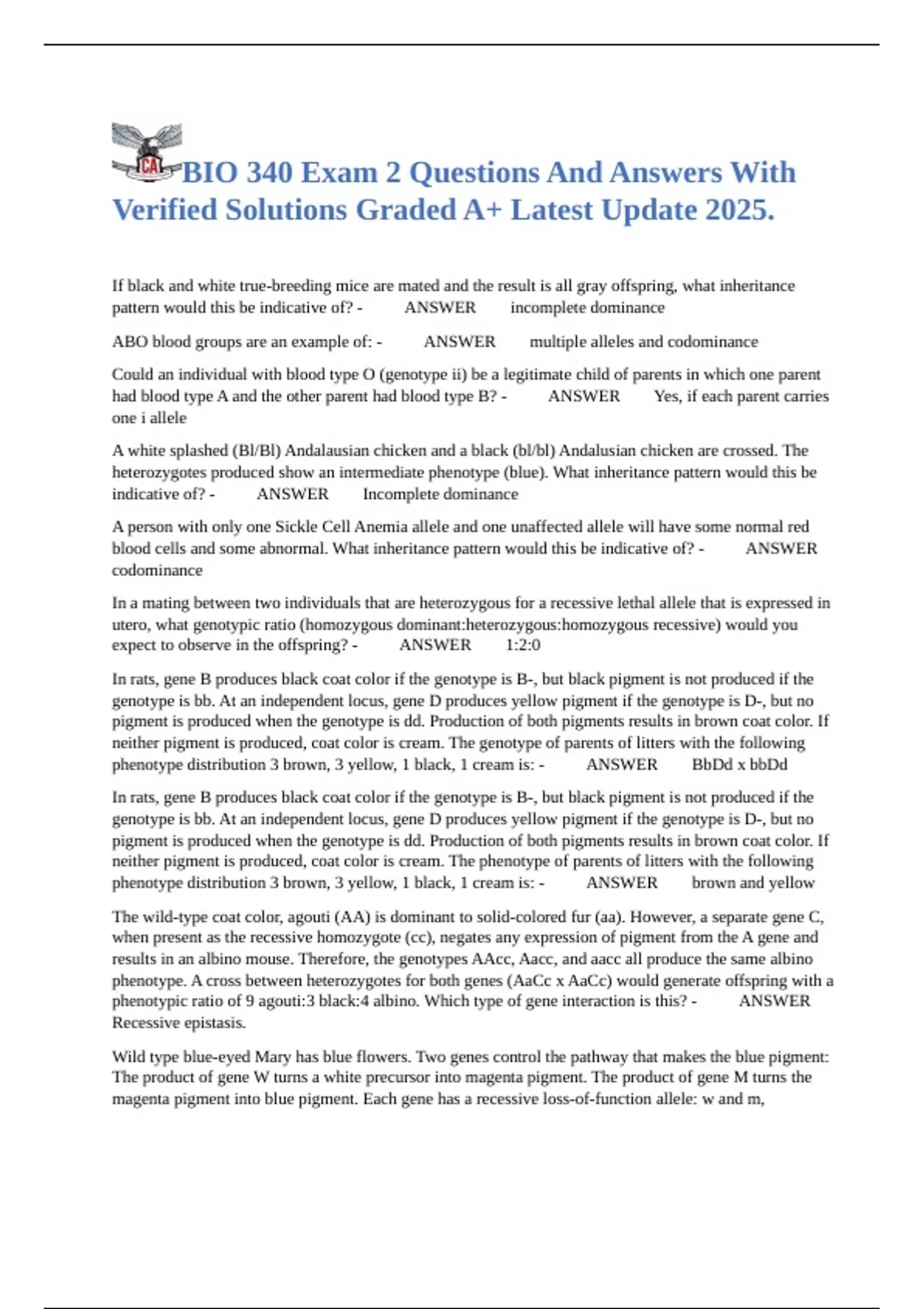 BIO 340 Exam 2 Questions And Answers With Verified Solutions Graded A+ Latest Update 2025.