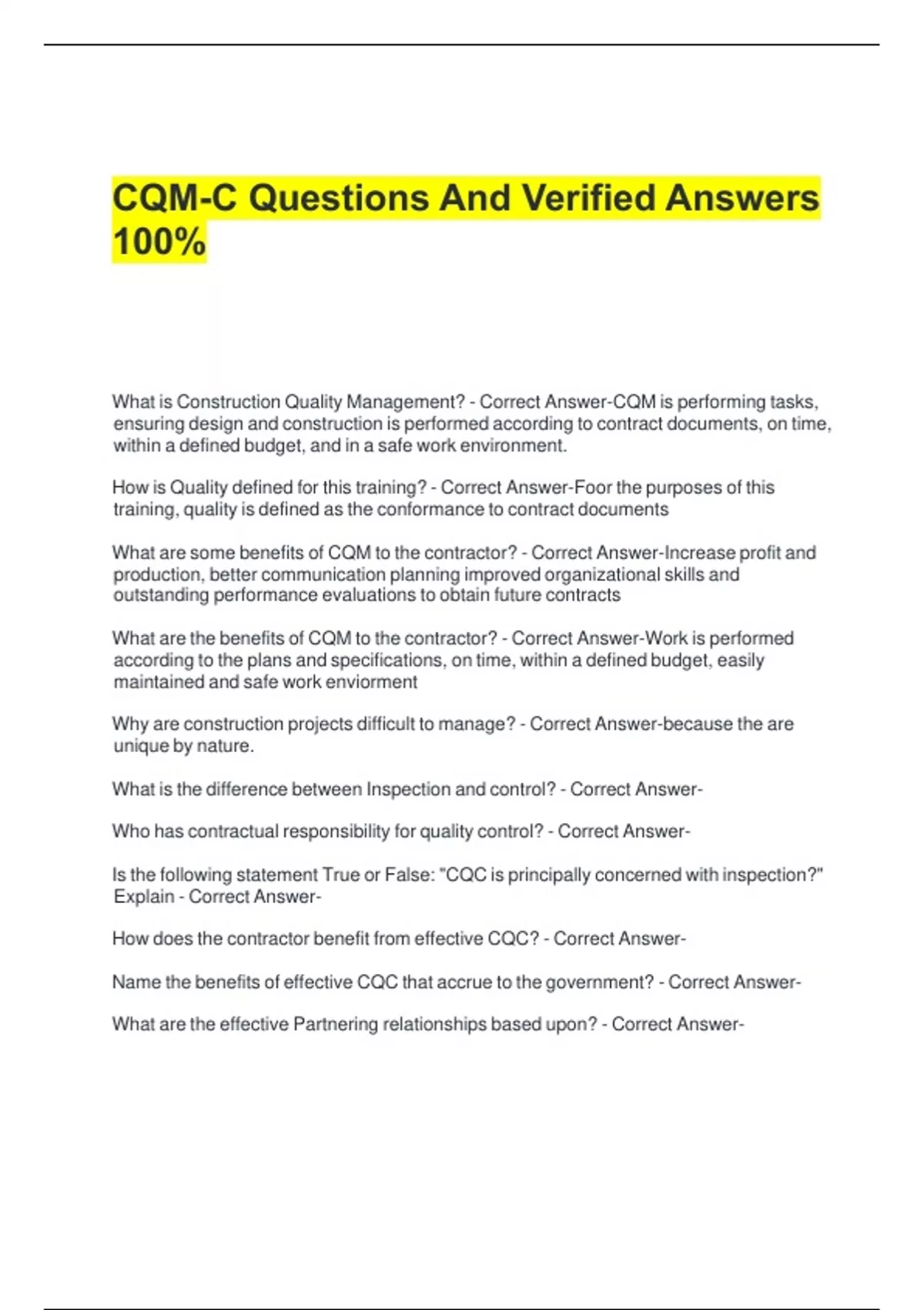 CQM-C Questions And Verified Answers 100%