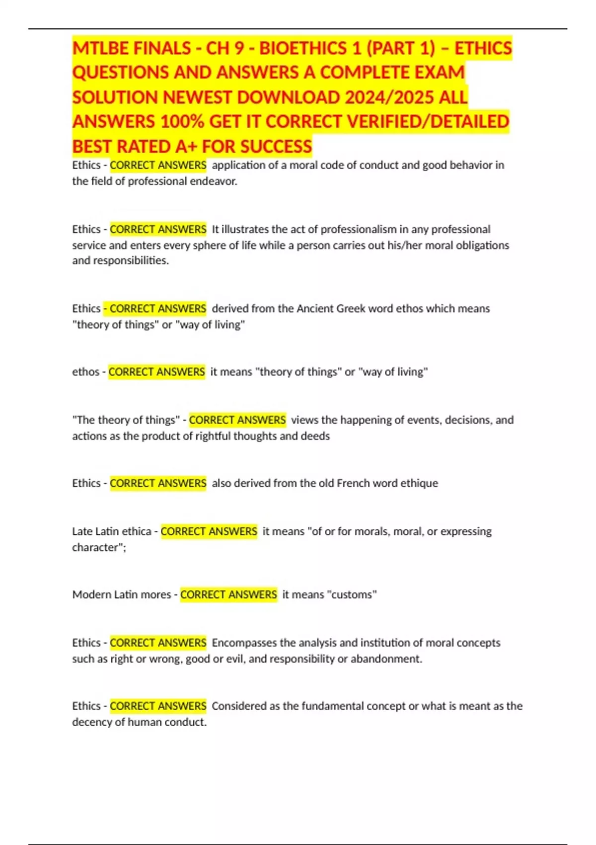 Ethics - CORRECT ANSWERS May also mean "morality"