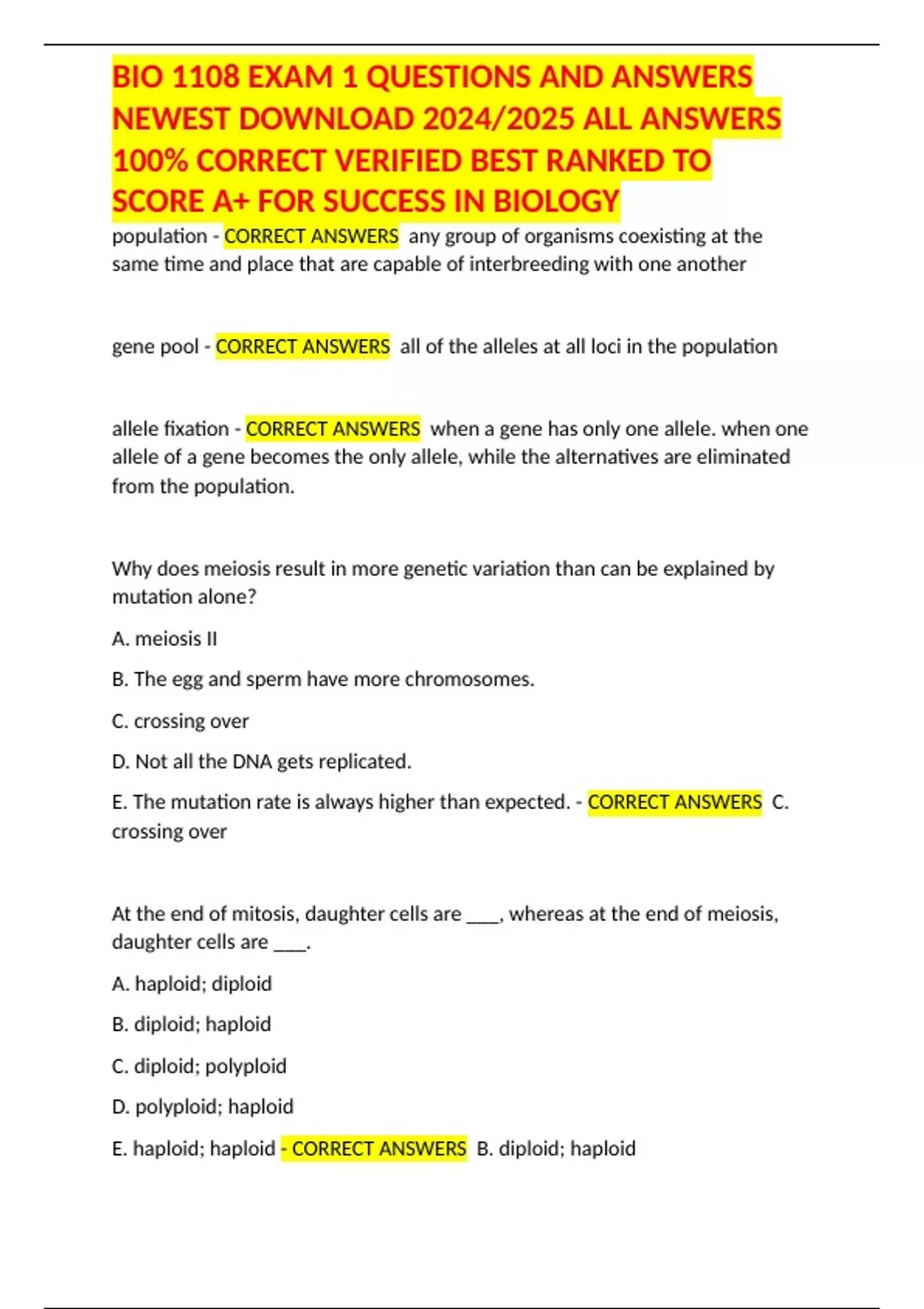 ,BIO 1108 EXAM 1 QUESTIONS AND ANSWERS