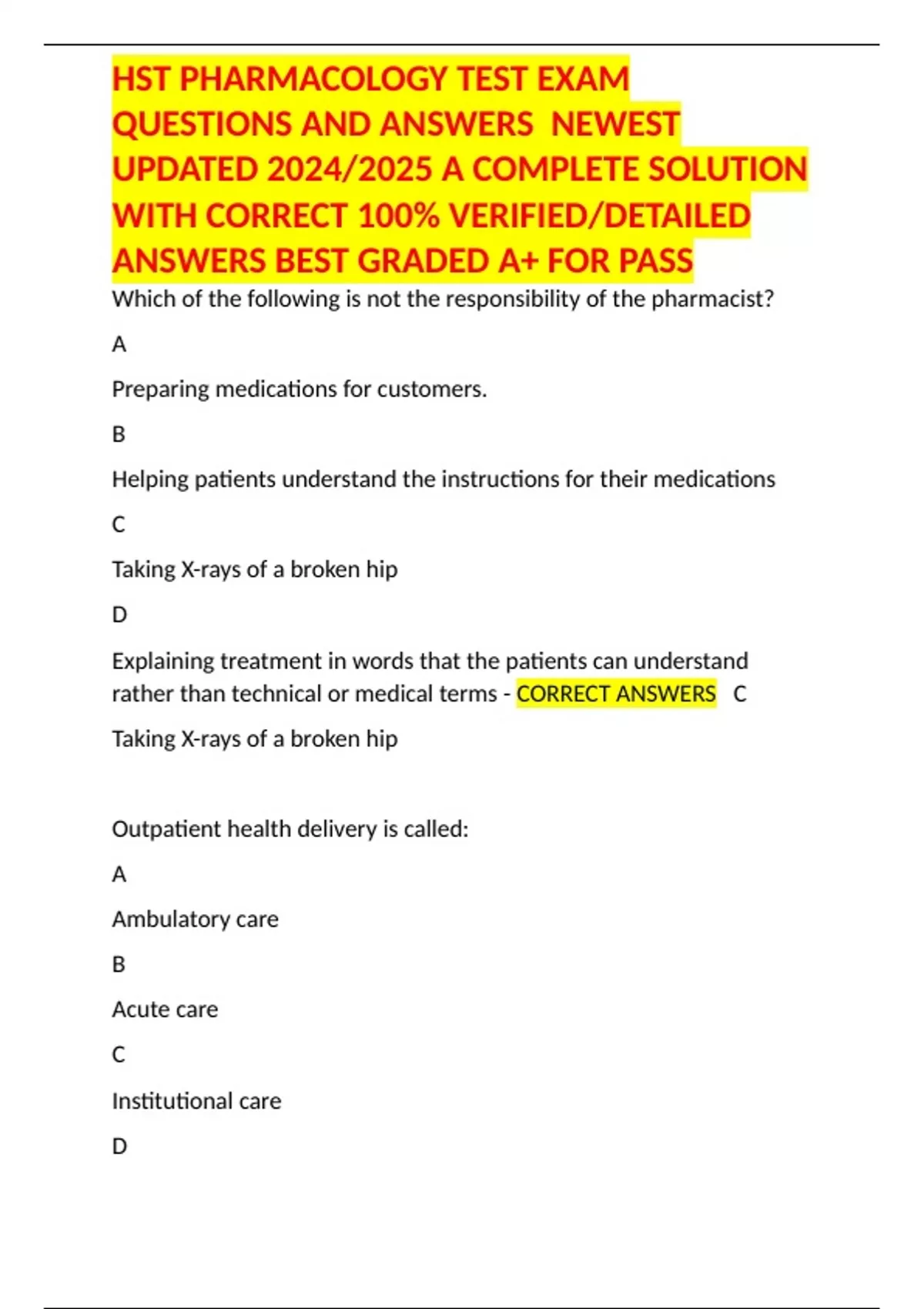 HST PHARMACOLOGY TEST EXAM QUESTIONS AND ANSWERS NEWEST UPDATED 2024/2025 A COMPLETE SOLUTION WITH CORRECT 100% VERIFIED/DETAILED ANSWERS BEST GRADED A+ FOR PASS
