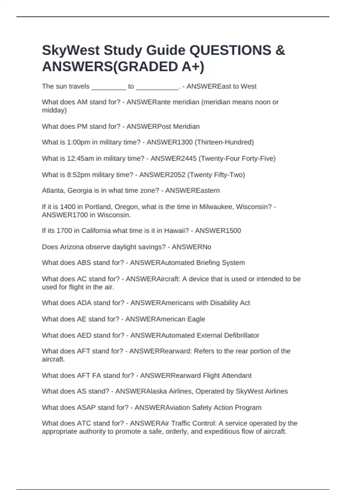 SkyWest Study Guide QUESTIONS &