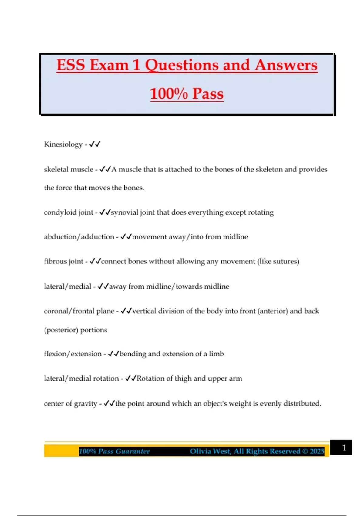 ESS Exam 1 Questions and Answers 100% Pass Kinesiology - skeletal muscle - A muscle that is attached to the bones of the skeleton and provides the force that moves the bones. condyloid joint - synovial joint that does everything except rotating abduction/adduction - movement away/into from midline fibrous joint - connect bones without allowing any movement (like sutures) lateral/medial - away from midline/towards midline coronal/frontal plane - vertical division of the body into front (anterior) and back (posterior) portions flexion/extension - bending and extension of a limb lateral/medial rotation - Rotation of thigh and upper arm center of gravity - the point around which an object's weight is evenly distributed. 2100% Pass Guarantee Olivia West, All Rights Reserved © 2025 proximal/distal - nearer the trunk or attached end/farther from the trunk or point of attachment dorsal - back hyaline cartilage - Most common type of cartilage; it is found on the ends of long bones, ribs, and nose tarsals - ankle bones pelvic girdle - erector spinae - prime mover of back extension Sternocleidomastoid - flexes neck; rotates head clavicle - collar bone cruciate ligaments - make possible the movements of the knee sub-disciplines - pronation - turning the palm downward transverse plane - horizontal division of the body into upper a