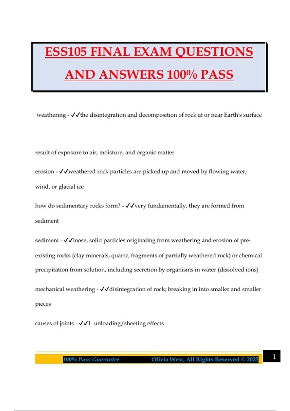 ESS105 FINAL EXAM QUESTIONS AND ANSWERS 100% PASS weathering - the disintegration and decomposition of rock at or near Earth's surface result of exposure to air, moisture, and organic matter erosion - weathered rock particles are picked up and moved by flowing water, wind, or glacial ice how do sedimentary rocks form? - very fundamentally, they are formed from sediment sediment - loose, solid particles originating from weathering and erosion of pre- existing rocks (clay minerals, quartz, fragments of partially weathered rock) or chemical precipitation from solution, including secretion by organisms in water (dissolved ions) mechanical weathering - disintegration of rock; breaking in into smaller and smaller pieces causes of joints - 1. unloading/sheeting effects 2100% Pass Guarantee Olivia West, All Rights Reserved © 2025 2. tectonic forces 3. cooling joints chemical weathering - the process by which rocks break down as a result of chemical reactions 3 classes of chemical weathering - 1. solution: dissolving limestone (calcite) by naturally acidic rain water; forms limestone caves 2. oxidation: rusting of iron-rich minerals 3. hydrolysis: changing feldspar (common minerals) into clay how do caves form? - - most are formed in limestone because it is soluble. - firstly groundwater dissolves the limestone - above the water table (where water begins), cave may be dry - features are widen into cavities and caves - below water table. water further dissolves the material chemical bonding on how minerals weather - - weak bonds such as calcite are soluble and can dissolve (ex. calcite)