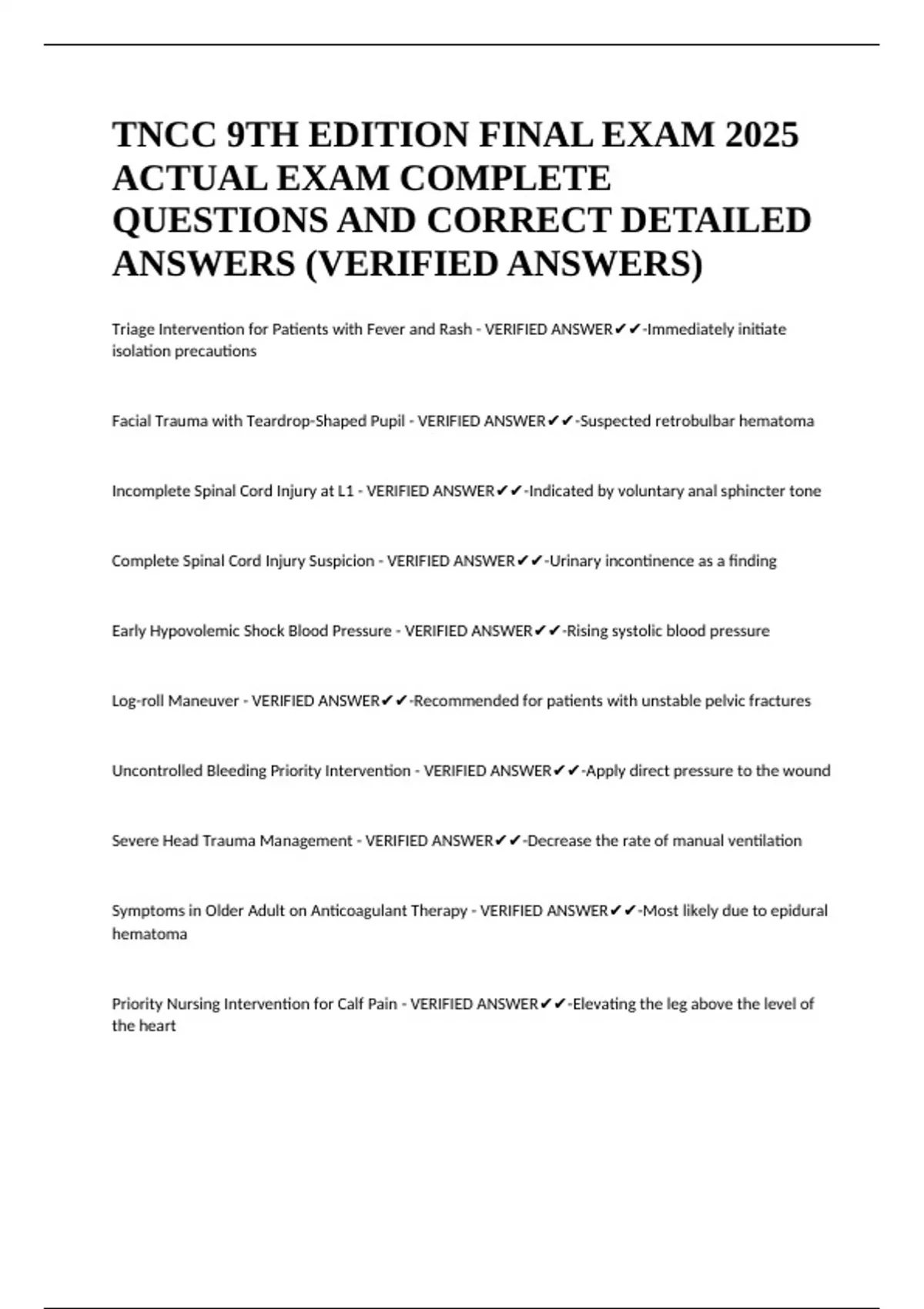 TNCC 9TH EDITION FINAL EXAM 2025 ACTUAL EXAM COMPLETE QUESTIONS AND CORRECT DETAILED ANSWERS (VERIFIED ANSWERS).