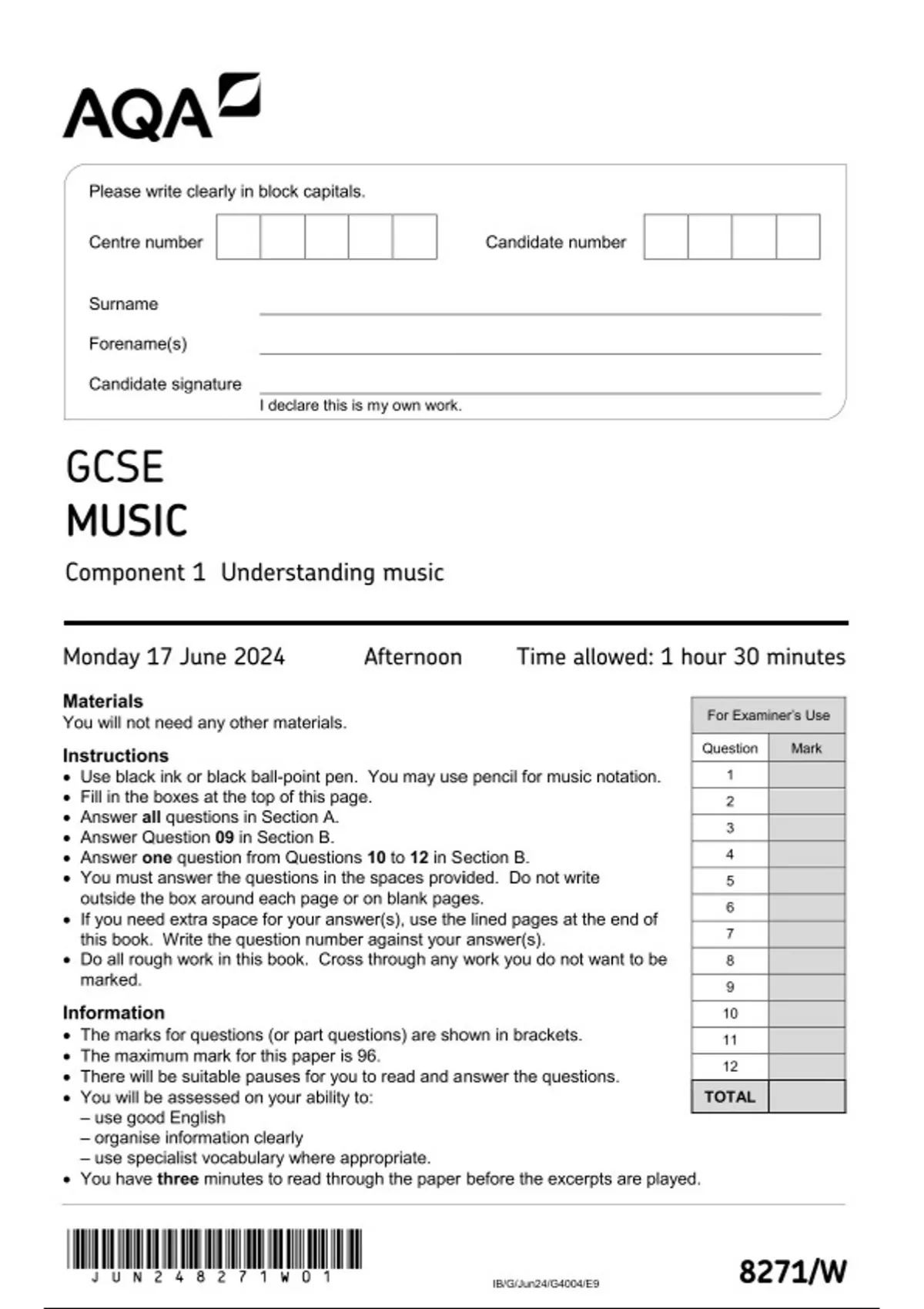 AQA GCSE MUSIC Component 1 JUNE 2024 QUESTION PAPER: Understanding music