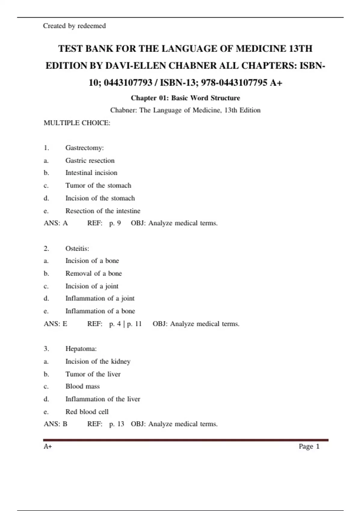 TEST BANK FOR THE LANGUAGE OF MEDICINE 13TH EDITION BY DAVI-ELLEN CHABNER ALL CHAPTERS: ISBN- 10; 0443107793 / ISBN-13; 978-0443107795 A+