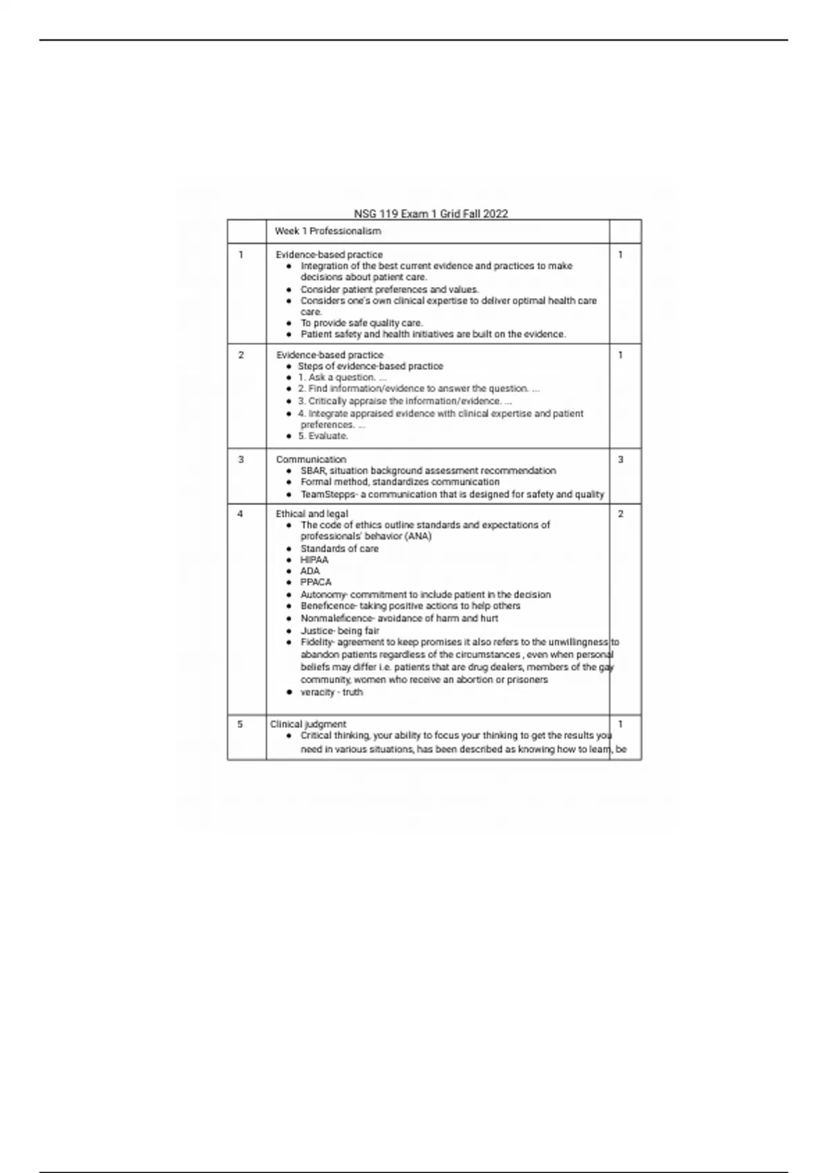 NSG 119 Exam 1 Grid Fall 2022