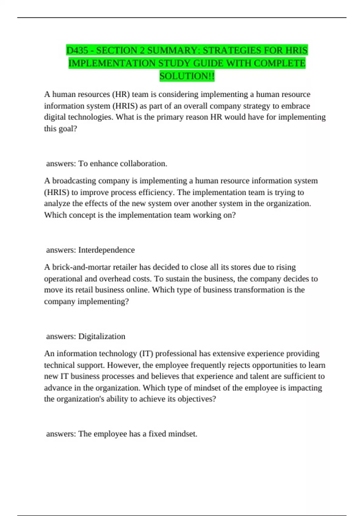 D435 - SECTION 2 SUMMARY: STRATEGIES FOR HRIS IMPLEMENTATION STUDY GUIDE WITH COMPLETE SOLUTION!!