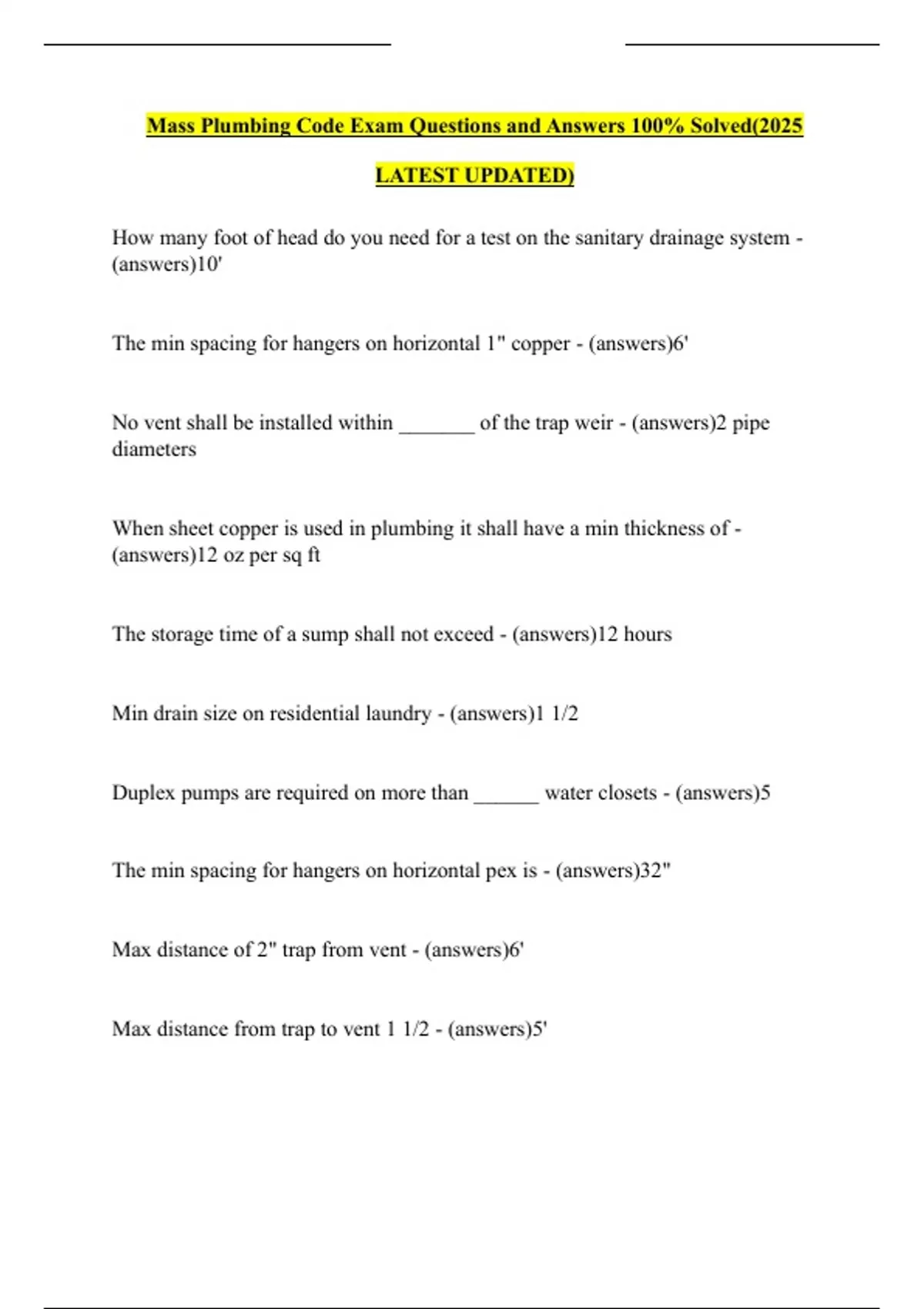 Mass Plumbing Code Exam Questions and Answers 100% Solved(2025