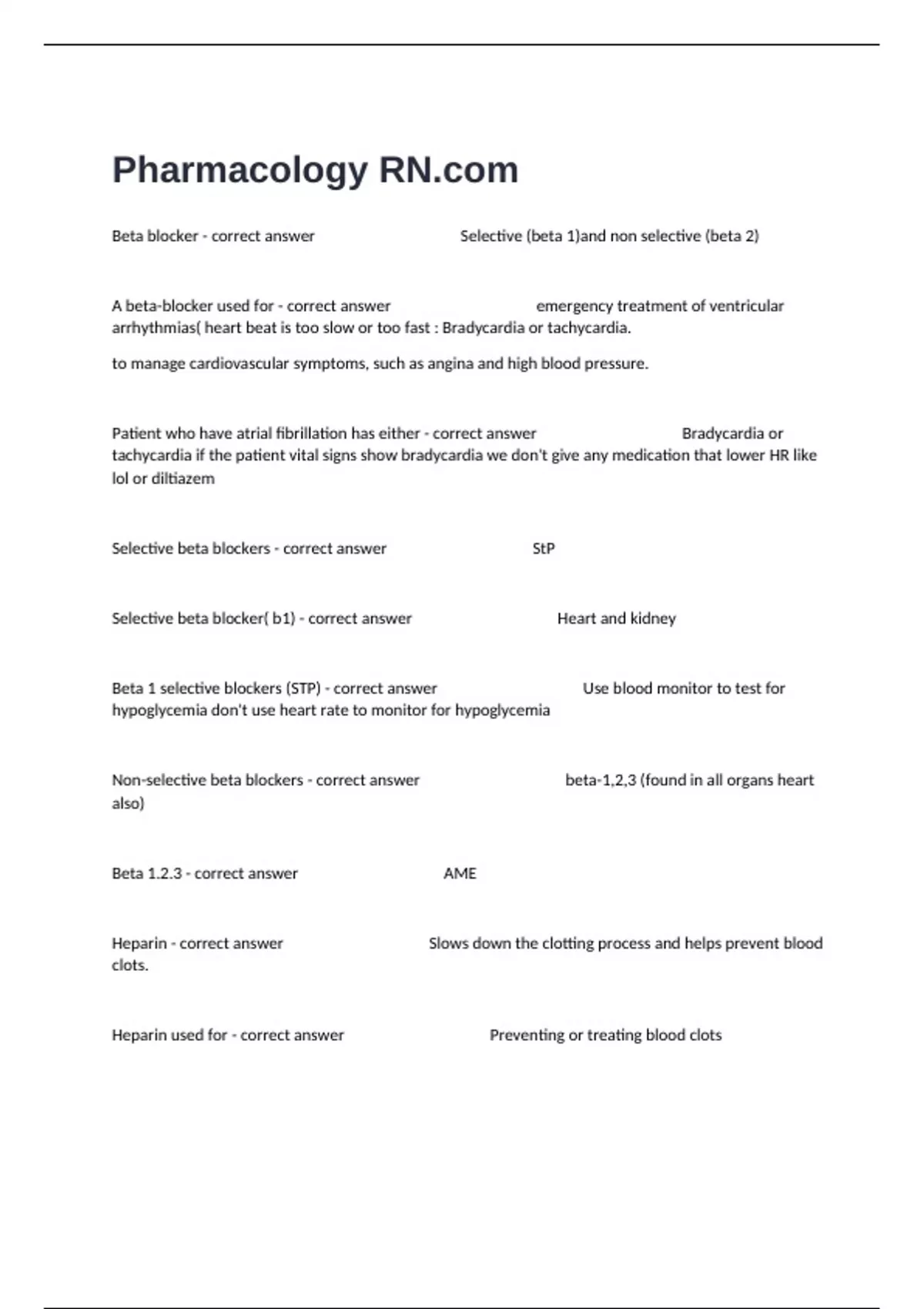 Beta blocker - correct answer Selective (beta 1)and non selective (beta 2)