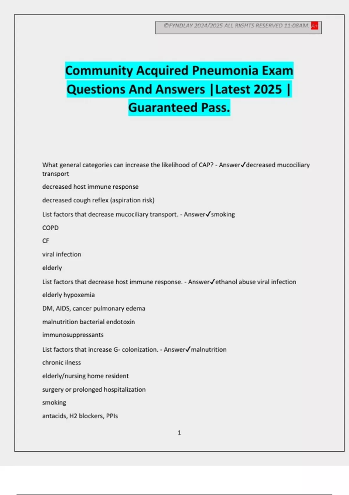 ©FYNDLAY 2024/2025 ALL RIGHTS RESERVED 11:08AM. A+ 1 Community Acquired Pneumonia Exam Questions And Answers |Latest 2025 | Guaranteed Pass. What general categories can increase the likelihood of CAP? - Answerdecreased mucociliary transport decreased host immune response decreased cough reflex (aspiration risk) List factors that decrease mucociliary transport. - Answersmoking COPD CF viral infection elderly List factors that decrease host immune response. - Answerethanol abuse viral infection elderly hypoxemia DM, AIDS, cancer pulmonary edema malnutrition bacterial endotoxin immunosuppressants List factors that increase G- colonization. - Answermalnutrition chronic ilness elderly/nursing home resident surgery or prolonged hospitalization smoking antacids, H2 blockers, PPIs
