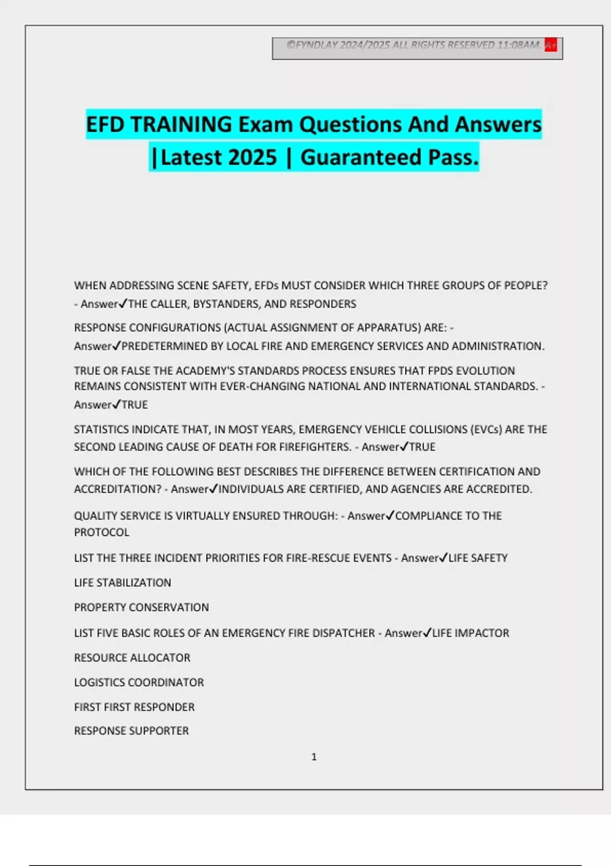 ©FYNDLAY 2024/2025 ALL RIGHTS RESERVED 11:08AM. A+ 1 EFD TRAINING Exam Questions And Answers |Latest 2025 | Guaranteed Pass. WHEN ADDRESSING SCENE SAFETY, EFDs MUST CONSIDER WHICH THREE GROUPS OF PEOPLE? - AnswerTHE CALLER, BYSTANDERS, AND RESPONDERS RESPONSE CONFIGURATIONS (ACTUAL ASSIGNMENT OF APPARATUS) ARE: - AnswerPREDETERMINED BY LOCAL FIRE AND EMERGENCY SERVICES AND ADMINISTRATION. TRUE OR FALSE THE ACADEMY'S STANDARDS PROCESS ENSURES THAT FPDS EVOLUTION REMAINS CONSISTENT WITH EVER-CHANGING NATIONAL AND INTERNATIONAL STANDARDS. - AnswerTRUE STATISTICS INDICATE THAT, IN MOST YEARS, EMERGENCY VEHICLE COLLISIONS (EVCs) ARE THE SECOND LEADING CAUSE OF DEATH FOR FIREFIGHTERS. - AnswerTRUE WHICH OF THE FOLLOWING BEST DESCRIBES THE DIFFERENCE BETWEEN CERTIFICATION AND ACCREDITATION? - AnswerINDIVIDUALS ARE CERTIFIED, AND AGENCIES ARE ACCREDITED. QUALITY SERVICE IS VIRTUALLY ENSURED THROUGH: - AnswerCOMPLIANCE TO THE PROTOCOL LIST THE THREE INCIDENT PRIORITIES FOR FIRE-RESCUE EVENTS - AnswerLIFE SAFETY LIFE STABILIZATION PROPERTY CONSERVATION LIST FIVE BASIC ROLES OF AN EMERGENCY FIRE DISPATCHER - AnswerLIFE IMPACTOR RESOURCE ALLOCATOR LOGISTICS COORDINATOR FIRST FIRST RESPONDER RESPONSE SUPPORTER