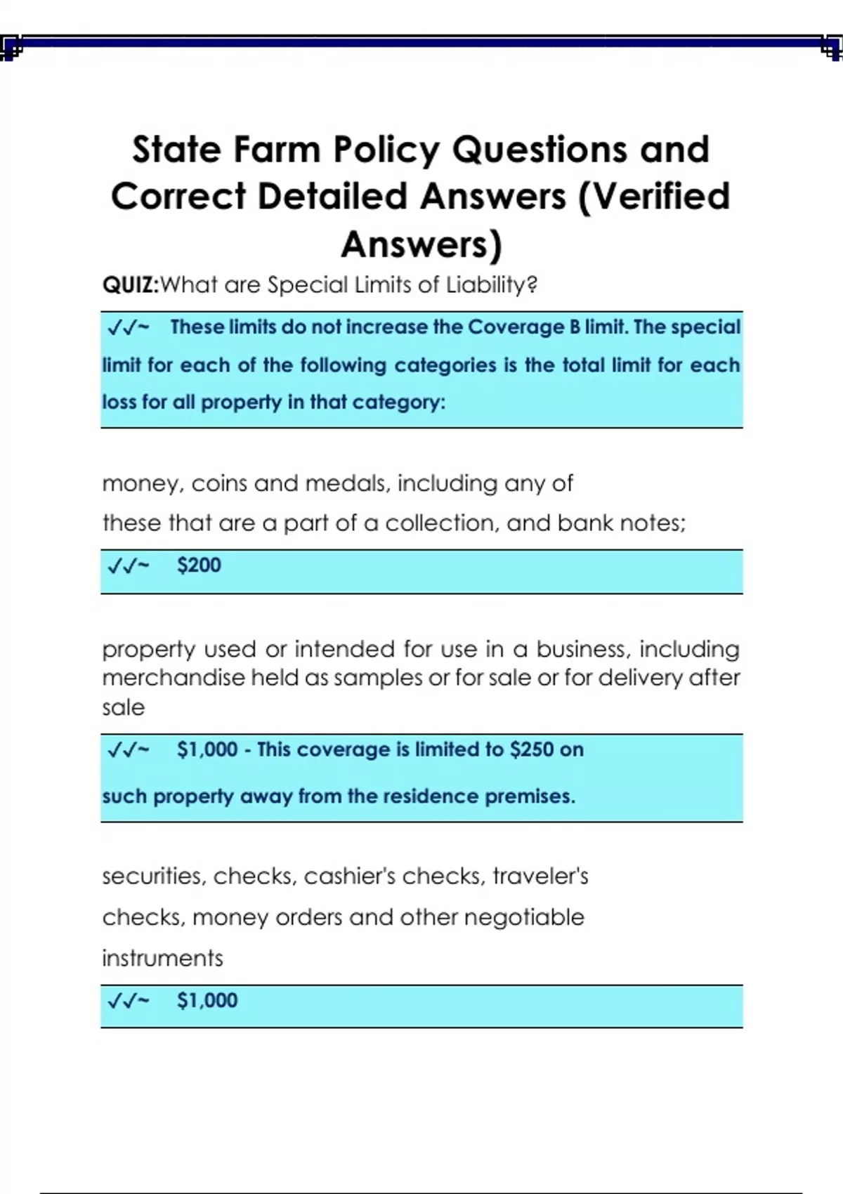 QUIZ:What are Special Limits of Liability? ~ These limits do not increase the Coverage B limit. The special limit for each of the following categories is the total limit for each loss for all property in that category: money, coins and medals, including any of these that are a part of a collection, and bank notes; ~ $200 property used or intended for use in a business, including merchandise held as samples or for sale or for delivery after sale ~ $1,000 - This coverage is limited to $250 on such property away from the residence premises. securities, checks, cashier's checks, traveler's checks, money orders and other negotiable instruments ~ $1,000 watercraft of all types and outboard motors, including their trailers, ~ $1,000 trailers not used with watercraft; ~ $1,000 stamps, trading cards and comic books, including any of these that are a part of a collection; ~ $2500